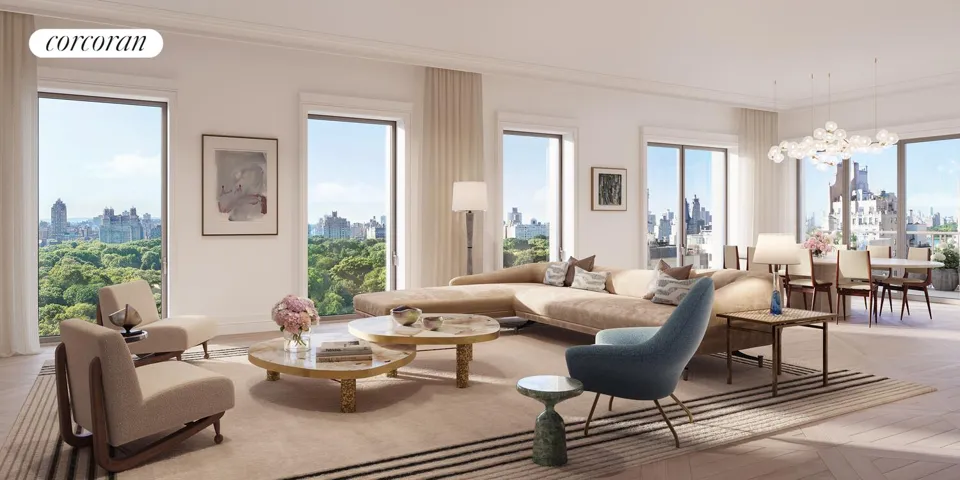 Tower residence 56S is a gracious 4,982 square-foot, half floor home with, 5 bedrooms, 6.5 bathrooms and a spectacular private loggia overlooking Central Park and Midtown Manhattan. Walls of glass frame spectacular views of Central Park, The Hudson River, and the NYC skyline. This grand residence features ceiling heights up to 14’6” and exceptional finishes throughout.\n