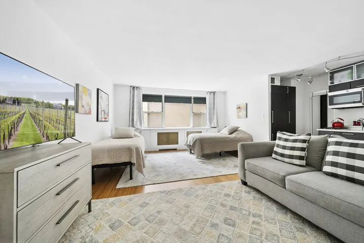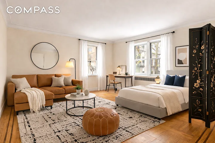 Step into this oversized studio with prewar charm, offering the feel of a one-bedroom in a serene rear corner of a classic Art Deco elevator building. \n