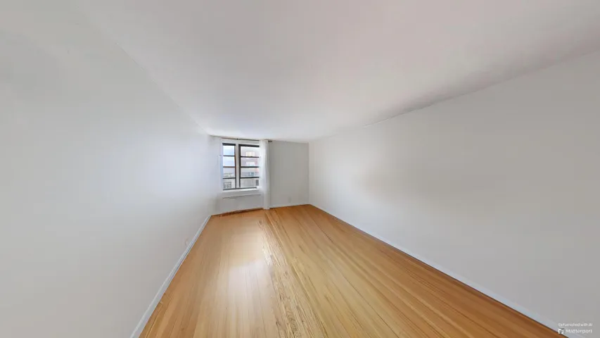The apartment opens into a generously sized living and bedroom area, highlighted by a west-facing window overlooking the building's courtyard offering natural light and quiet living. Down the hallway, you’ll find a well-appointed bathroom complete with a dressing area and an additional closet for excellent storage.\n