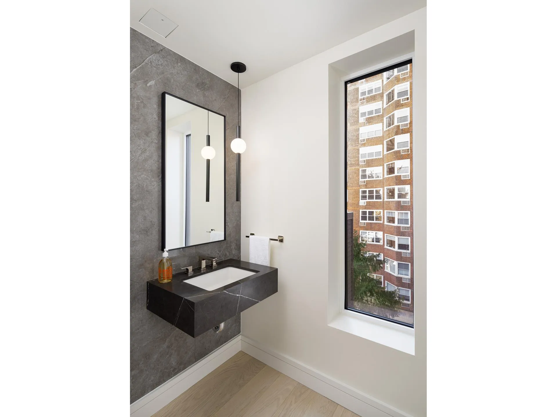 This premier one-bedroom, one-and-a-half bath residence is a true trophy for its floor-through flow and its beautiful glass-enclosed, south-facing terrace. With both northern and southern exposures, this home is bathed in natural light, further enhanced by its panoramic windows, 9’8″ ceilings, and Italian White Oak wide-plank flooring. The terrace offers a rare opportunity to enjoy seamless indoor-outdoor living, making it the centerpiece of this luxurious residence. The VRF heating and cooling system ensures personalized comfort. Laundry closets, equipped with Miele washer and dryer, add convenience. Elegant neutrals pervade the Primary Bath palette. A custom Tambour fluted wood-veneer vanity with blackened steel-frame mirrored medicine cabinet create pleasing shapes and lightly rendered lines that are in keeping with building’s tightly tailored aesthetic. A study in subtlety, the Powder Room walls are covered in grey Xtone Fiori di Bosco large format sintered polished marble tiles. The moody shade of the custom Grafite honed marble stone slab vanity completes the composition.