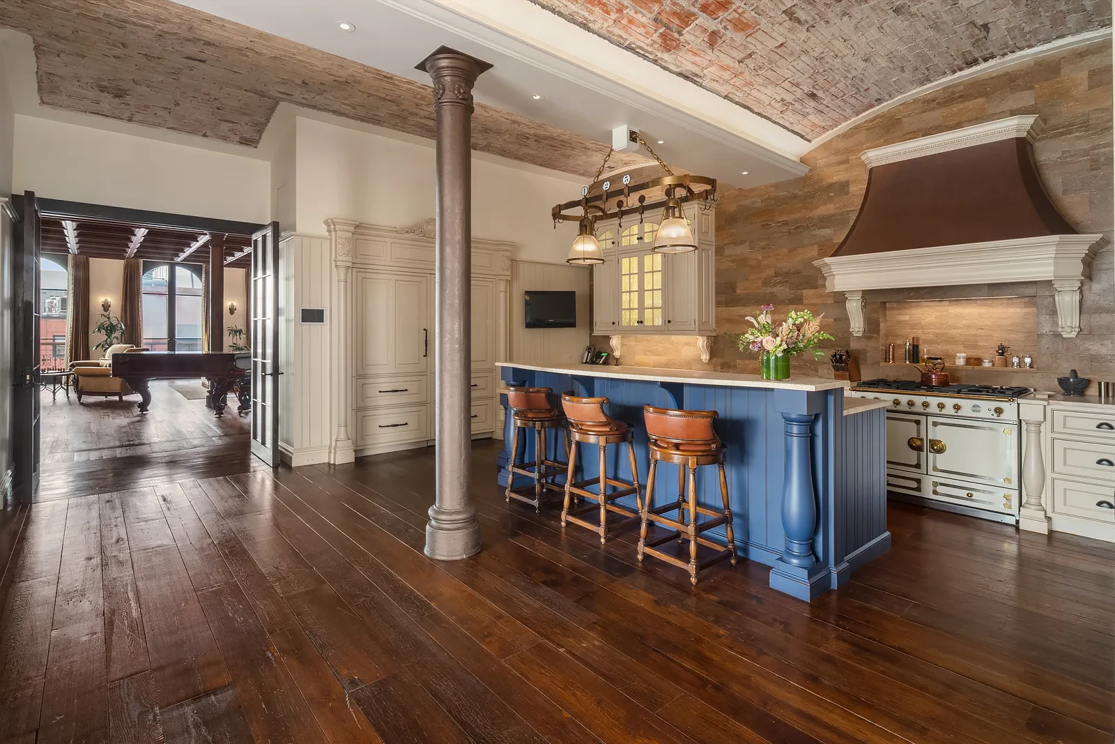 A home within a home, the palatial first level satisfies the needs of the most discerning connoisseur of high design and ultimate comfort. Bathed in light thanks to a wall of massive arched windows, the enormous, jaw-dropping living room features a hand-carved backlit Onyx bar, and an original 17th-Century Dutch Tudor fireplace. The living room also boasts bespoke wood-coffered and copper leaf barrel-vaulted ceilings, meticulously maintained original cast-iron columns and reclaimed wide plank Oak floors.