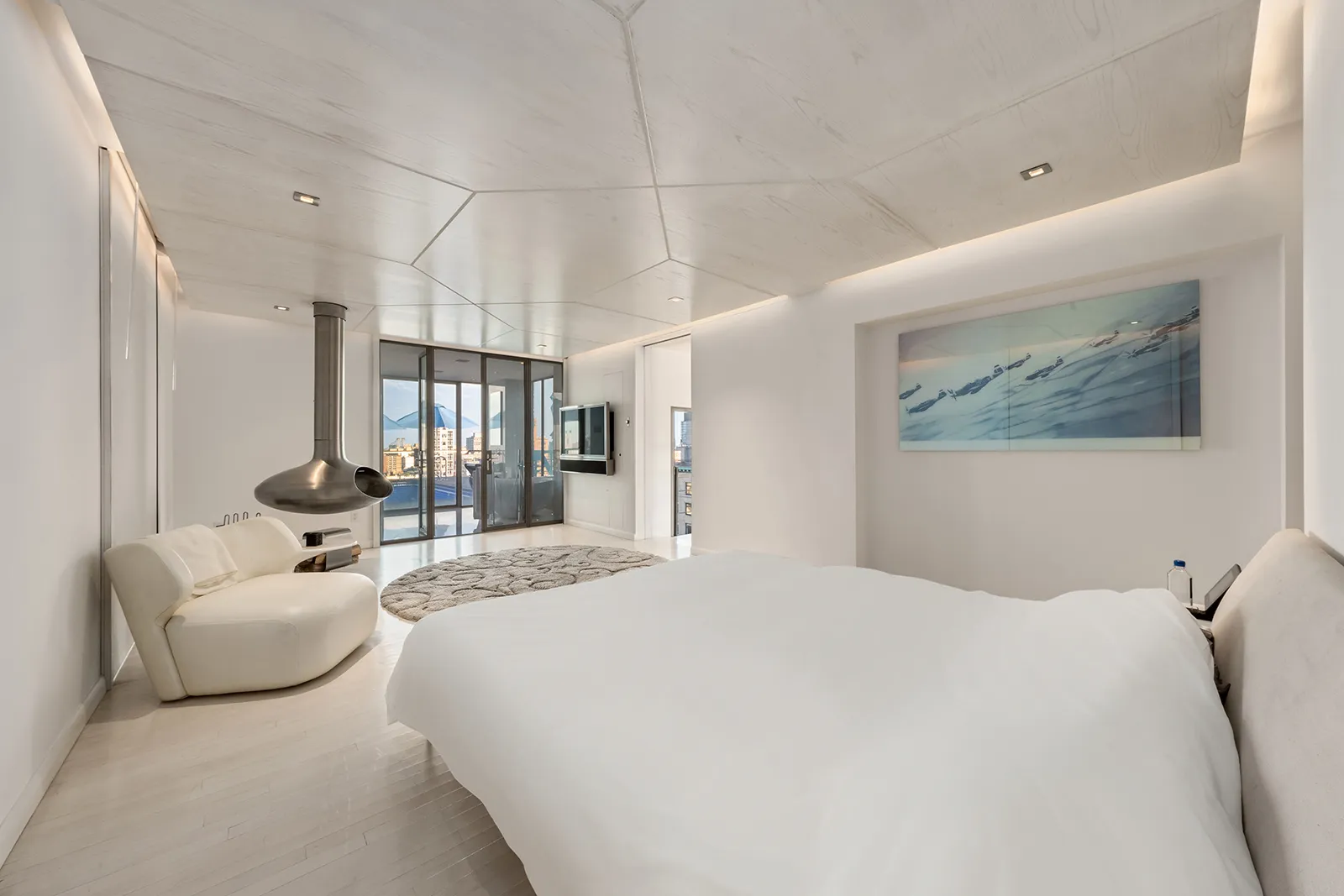 Unheard of in Manhattan real estate and underscoring this home’s absolute grandeur, a second principal-sized suite sits perched in the sky and boasts a full dressing room, White Oak flooring and a contemporary suspended fireplace. Wrapped in floor-to-ceiling Smartglass windows, the marble-clad ensuite bathroom, with a custom, white marble soaking tub and swooping sink, leads to a heated outdoor pool/deck with truly jaw-dropping, unobstructed western views.