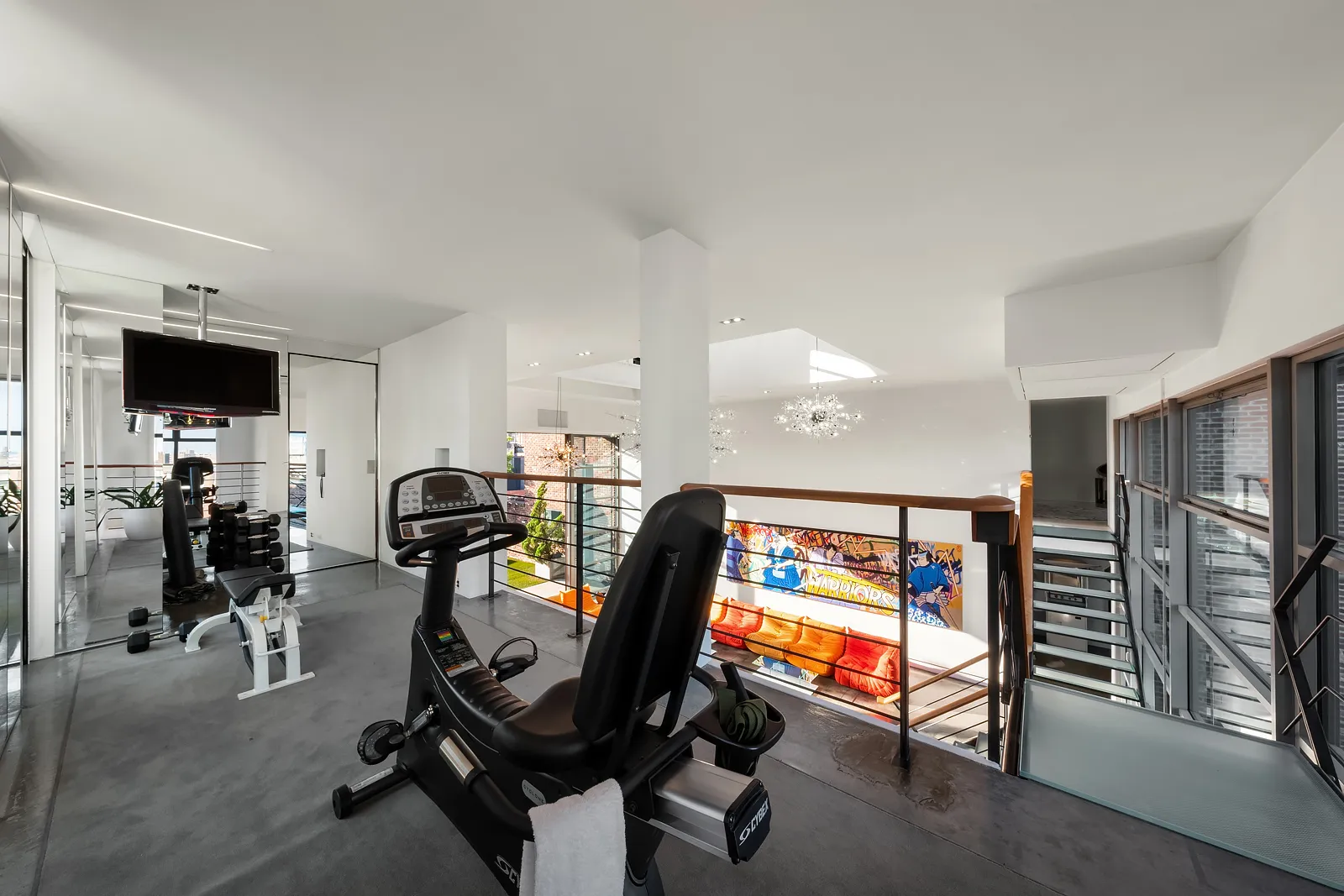 The upper levels of this unparalleled mansion represent peak, luxurious form and ultimate, considered function. Essentially a second, separate home, the top two floors are accessed either via a staircase from the main floor, or a private keyed elevator. Formerly known as Sky Studios, the colossal, glass-enclosed great room maximizes natural light and boasts 17’ high ceilings and spills out onto a perfectly-landscaped garden with sweeping western views. A well-appointed chef’s kitchen features Viking appliances, stainless steel finishes, an east-facing breakfast bar, and an adjacent powder room. A fully equipped home theater/media room and huge fourth bedroom sit across the way with a shared full ensuite bath. Rounding out this astonishing layout is a mezzanine-level gym with accompanying massage room.