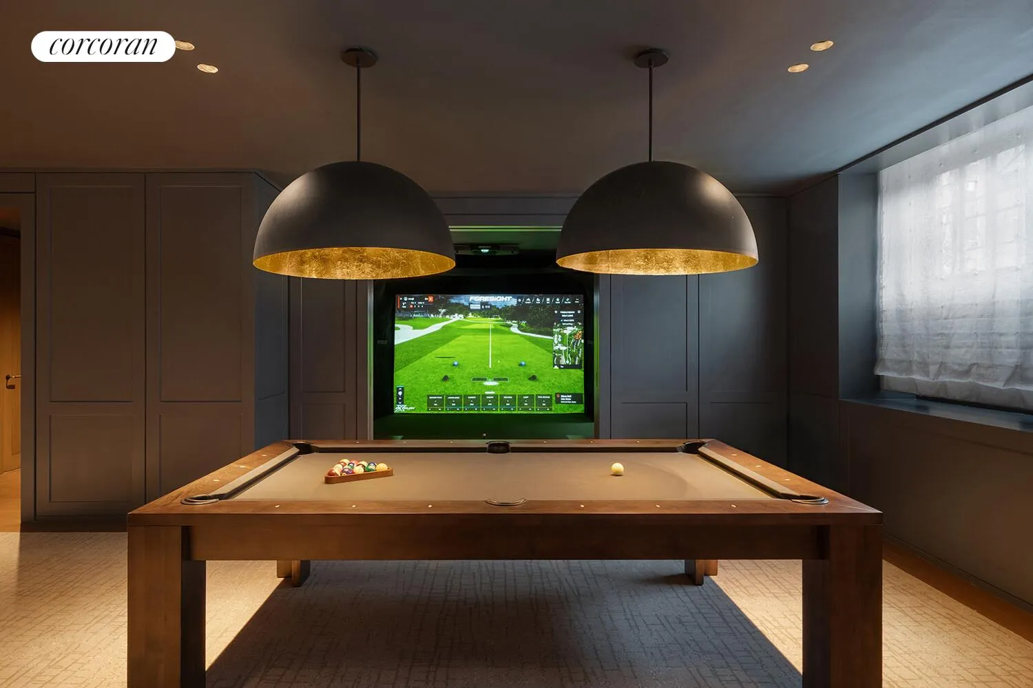 A custom Italian kitchen designed by Boffi features a hand selected honed Namibia Rose marble countertop and backsplash, white oak cabinetry, fluted, reflective bronze upper doors and Waterworks polished chrome hardware and complete with a large pantry for ample storage. Professional-grade appliances include Sub-Zero refrigerator, Wolf Range, Wolf speed oven, Wolf steam oven, wine fridge, and Cove dishwasher.