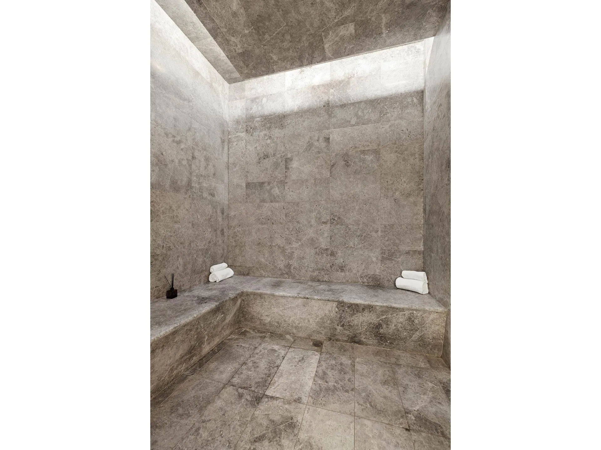 The chef-inspired kitchen is an entertainer’s dream, showcasing the very best in luxury appliances. It features premium stainless steel Gaggenau appliances, including a refrigerator and freezer, wine refrigerator, gas range, dishwasher, and speed oven, all perfectly integrated into custom Italian walnut cabinetry. The honed Grigio Nicola marble countertops and statement slab backsplash add a touch of refined beauty, while the custom island with its striking waterfall edge serves as both a functional workspace and a show-stopping focal point.
