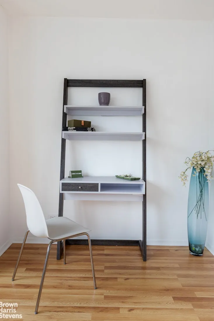 The galley kitchen boasts stone countertops, white cabinetry, brand-new stainless steel appliances, and an under-counter sink-perfect for both everyday use and entertaining. The spacious alcove can easily serve as a home office or sleeping area, providing versatile living options.
