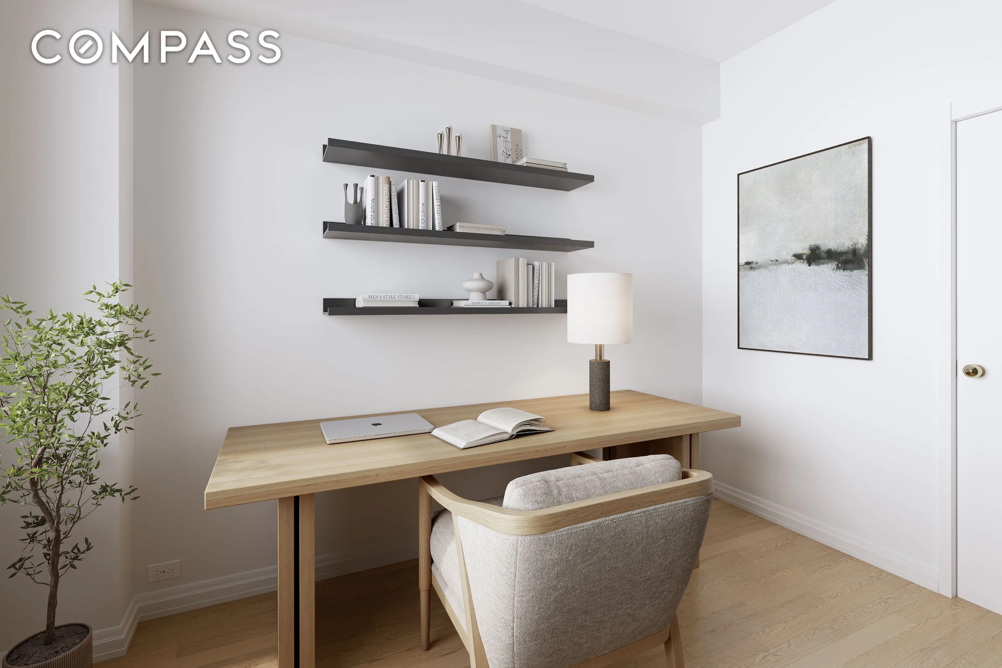 Inside this high-floor sanctuary, palatial interiors are filled with tall ceilings, hardwood floors, impeccable millwork, and walls of windows capturing open-sky views to the east, west and south. The sizeable foyer makes a gracious welcome with a powder room, walk-in coat closet and wet bar. To the left, the 25-foot-long living room invites you to stretch out and relax alongside floor-to-ceiling custom shelving and paneling, a decorative fireplace and stunning views of the Park Avenue Mall. Across the foyer, the formal dining room sets the stage for lavish dinner parties with carved wainscoting, dentil crown molding, a crystal chandelier and Central Park outlooks. The adjacent windowed kitchen makes entertaining easy with rows of cabinetry, stone countertops and stainless steel appliances, including a gas range, French door refrigerator, dishwasher and built-in microwave.