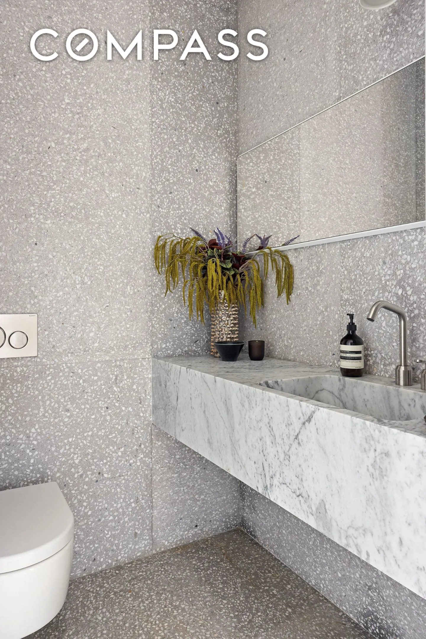 Upstairs, the primary suite offers a peaceful retreat with custom Rimadesio closets and a spa-like en-suite bathroom clad in Bianco Venato Carrara marble, complete with a soaking tub, oversized rain shower, and double vanity carved from a single slab. Three additional bedrooms and two full baths are located on the upper floor, each with generous closet space and refined terrazzo finishes. A full laundry room, utility sink, and a secondary elevator entrance round out the home’s thoughtful layout.