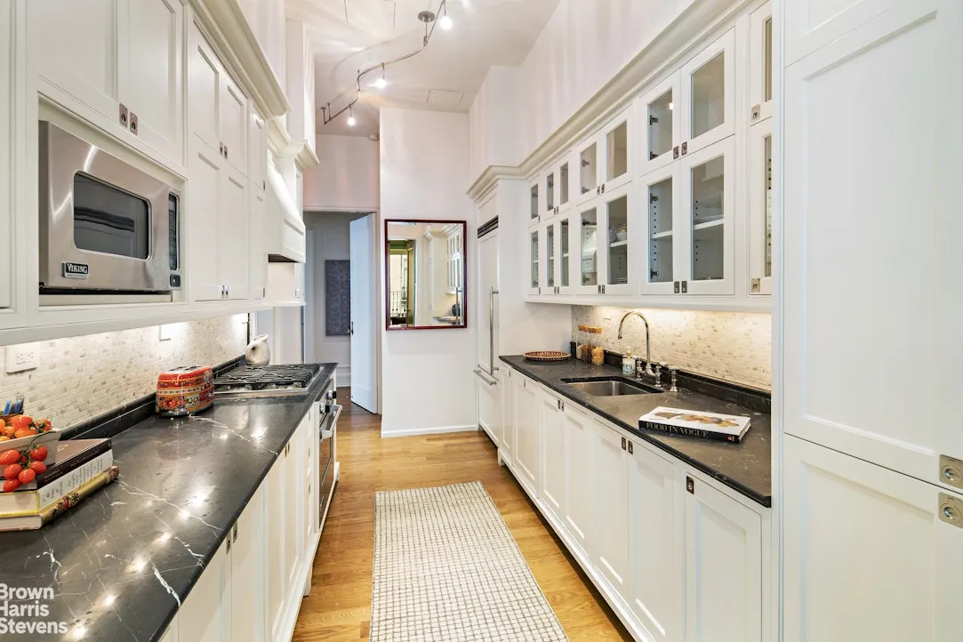 The large kitchen with Nero Marquina marble countertops, has top-of-the-line stainless steel Viking and Miele appliances including a Viking gas range.