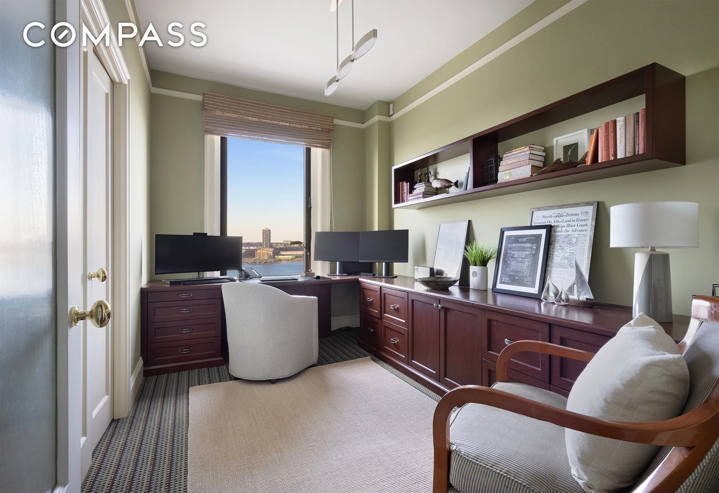 Along the River-facing wing is a large study outfitted with custom mahogany built-ins and desk, as well as an additional custom walk-in closet, and a separate bedroom suite which features built-in double desks and is complemented by an adjacent den, offering flexible use as a media room, office, or guest space, with a full bath. A fourth bedroom with its own second entrance is quietly positioned off the gallery and is served by an adjacent full bath and a private home office or study, providing excellent separation and privacy.