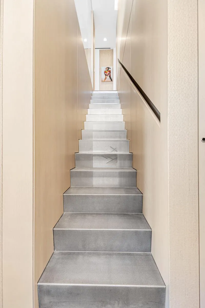 An architectural staircase connects the two levels, serving as both sculptural feature and structural anchor. Upstairs, the primary suite faces east and northeast, capturing soft morning light and open sky. Adjacent sits an additional bedroom suite, creating a private upper-level wing. This level also includes a substantial laundry room and a secondary entrance, offering flexibility and discreet access.