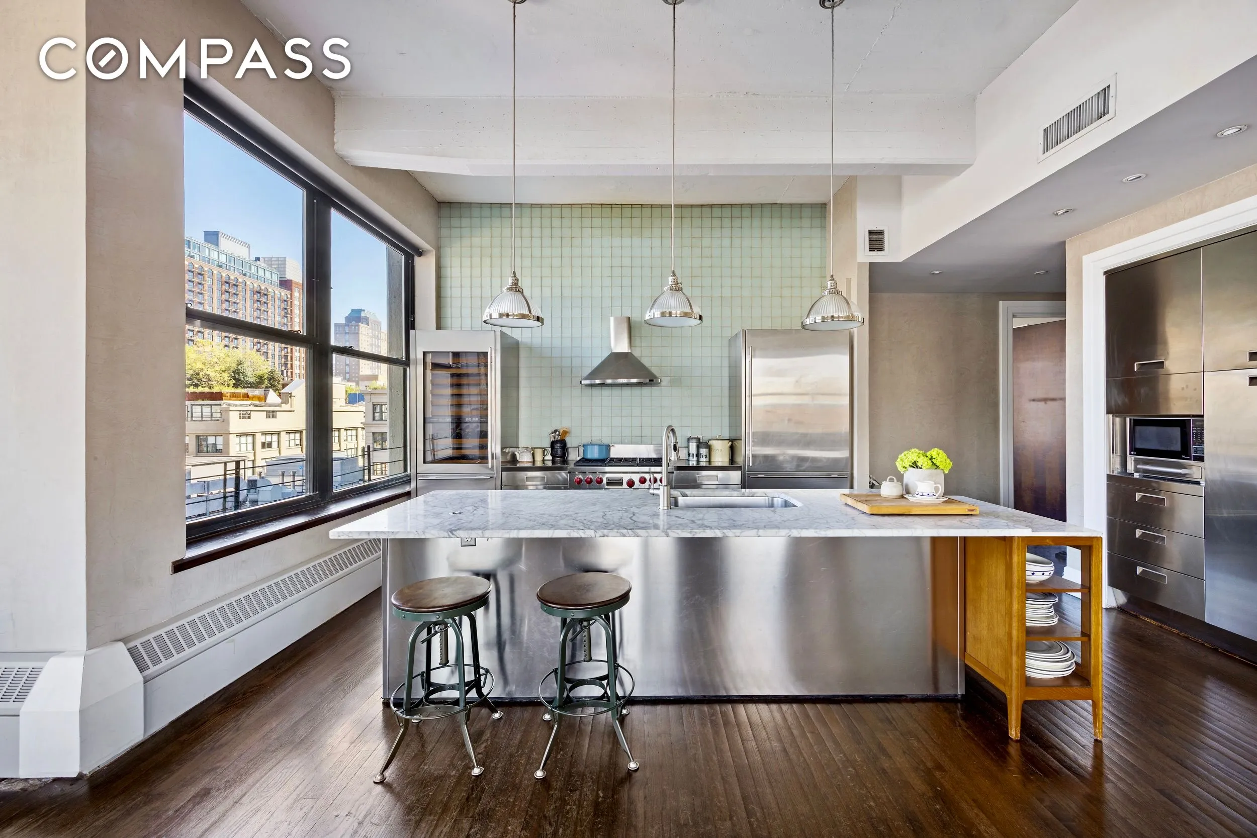 A private bedroom wing includes a serene primary suite with plentiful custom-built closet space, a spa-like bathroom with a two-sink vanity, separate tub, and a steam shower. A generously sized second bedroom with en-suite bathroom and a versatile home office that could serve as a third bedroom round out the bedroom wing of the home. Additional highlights include custom Poliform closets throughout, a walk-in laundry room, central air, hardwood floors, and Venetian plastered walls. Previously a factory, the solid concrete construction of this building also allows for complete quiet from neighbors all on all sides.