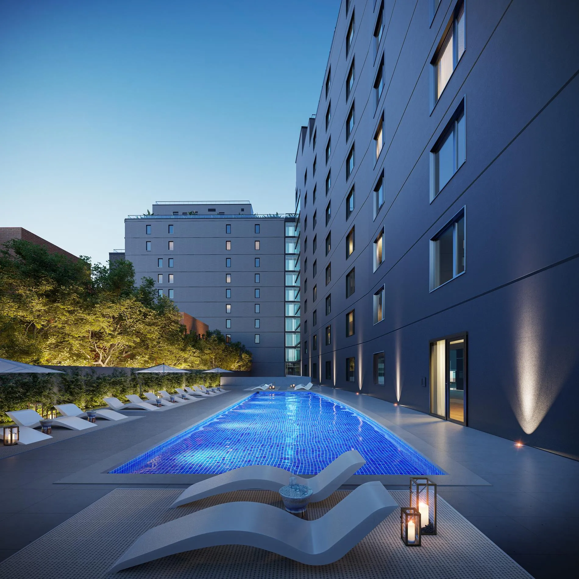 Residence G22 is a spacious two-bedroom, two-bathroom duplex that seamlessly blends indoor comfort with expansive outdoor living. The main level offers an open living and dining area that flows out to a large private terrace, perfect for entertaining or relaxing in the open air.