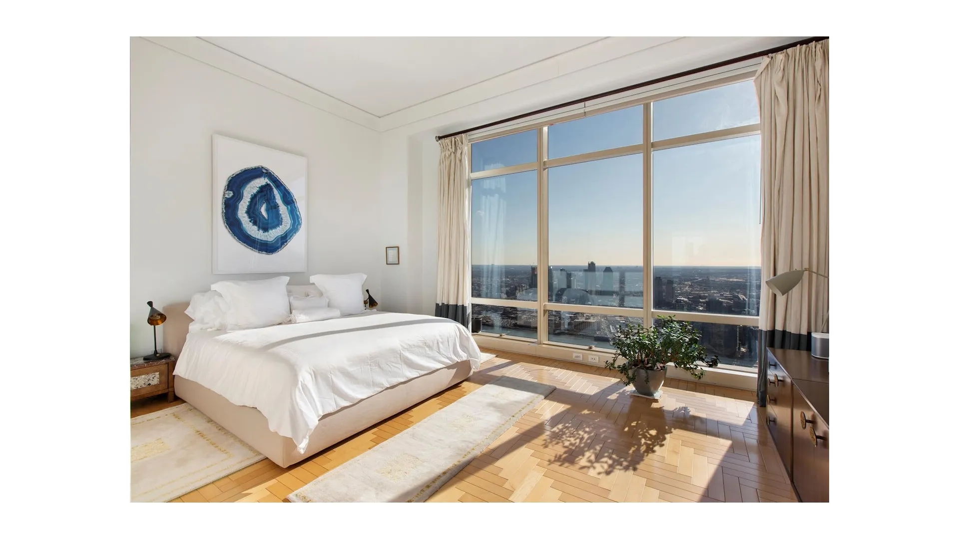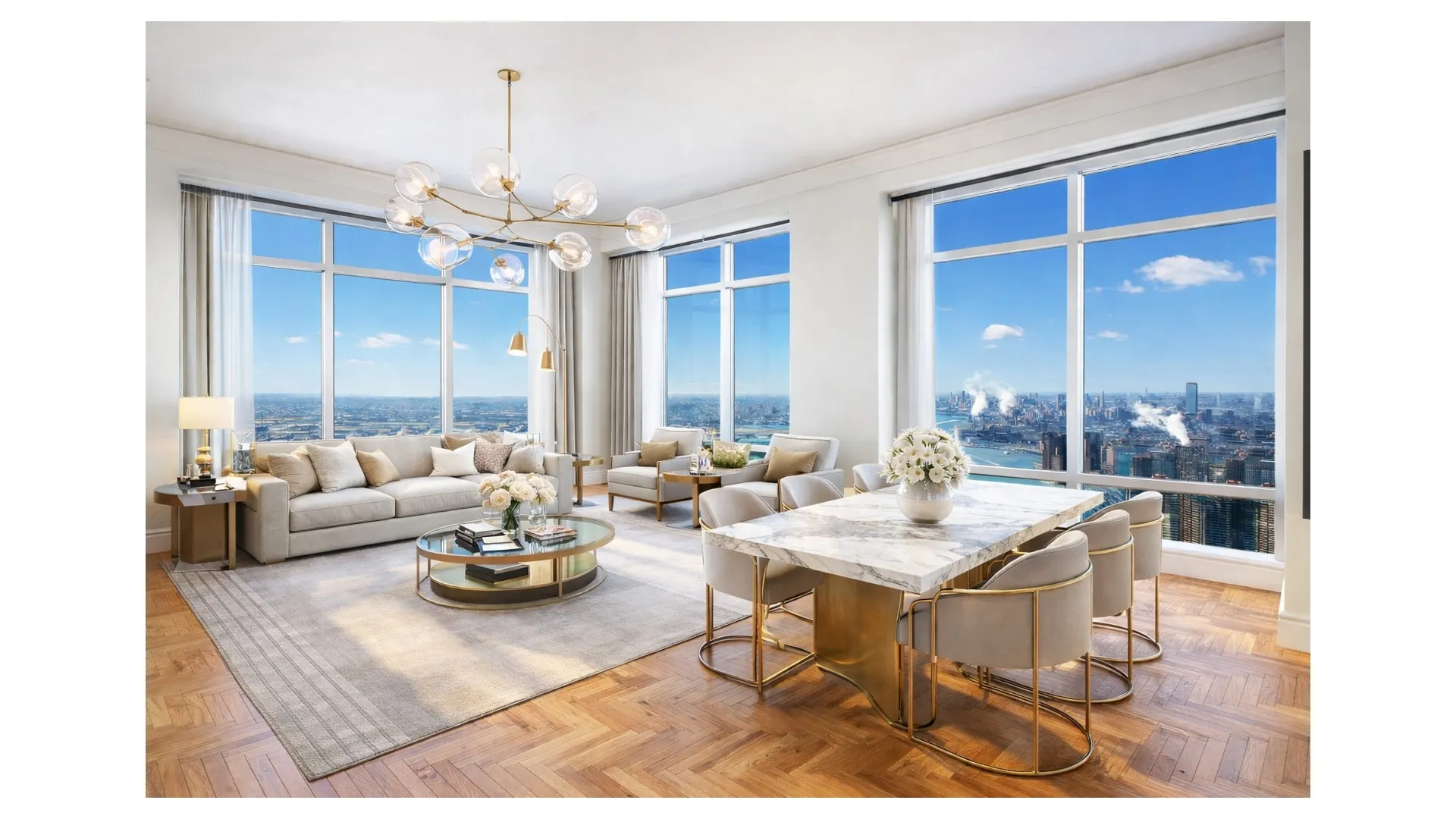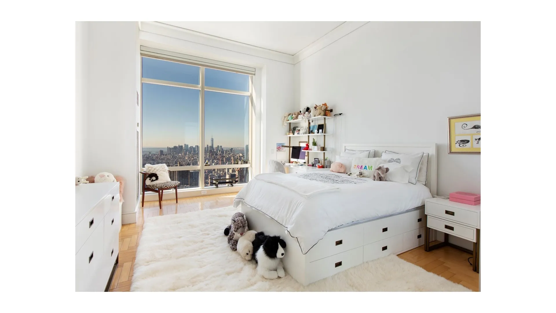 Exceptional 82nd Floor 4 bedroom, 3.5 bathroom corner residence in the Sky. This beautifully renovated SOUTH & EAST facing home encompasses almost 2900 square feet, with soaring 12-foot ceilings and Floor-to-Ceiling Windows throughout. Sunlight floods every room and the endless views are simply breathtaking. Perched high above the city, you will enjoy iconic helicopter views of New York City’s world famous landmarks, including the Empire State Building, Chrysler Building, 1 Vanderbilt, United Nations, Freedom Tower, gorgeous bridges, and the East River and beyond. The superbly renovated eat-in kitchen at the center of the home is replete with Miele and Sub-Zero stainless steel appliances, a banquette and a Sub-Zero wine cooler. Adjacent is a grand study or fourth bedroom with hand-crafted custom cabinetry and delightful river views. The master bedroom is lined with custom lacquer cabinetry and enjoys walk-in closets, automated blinds and a well appointed five-fixture marble bath. The two additional bedrooms also have en-suite marble baths and magnificent views. Other features include Multi-zone Central Air and Heat, automated blinds throughout, washer/dryer and a marble guest powder room.The building offers the highest quality of white glove services and amenities, including: a world class Health Club & Spa, Massage & treatment rooms, Sauna & Steam Rooms, 60 foot Salt-water Swimming Pool, playroom, Wine Cellar, Stunning new 2 Level Lounge & Conference Room called Club 845, landscaped Garden & courtyard, Porte cochere driveway with valet service and garage. The building also houses the delectable UN Plaza Grill restaurant.