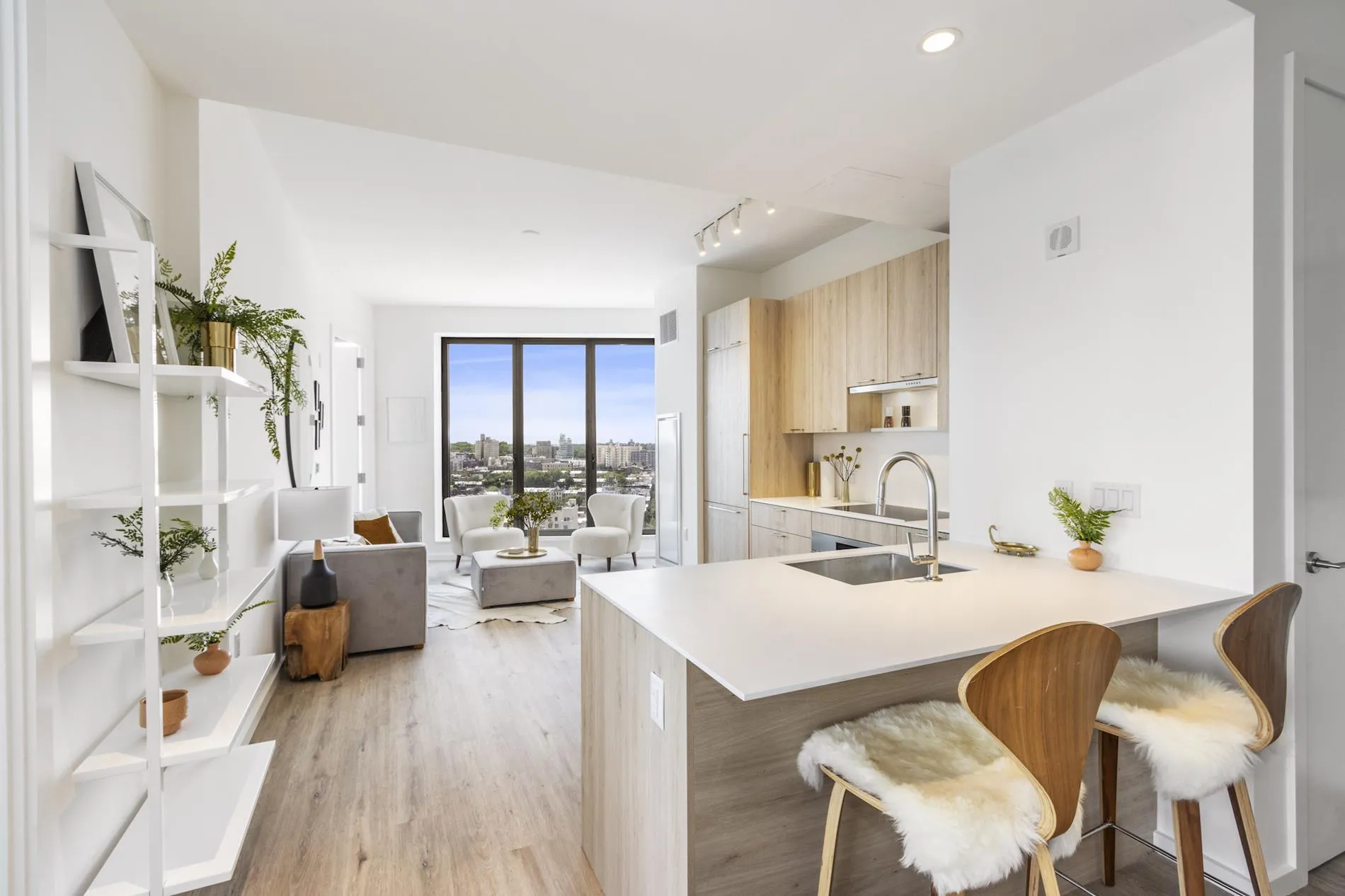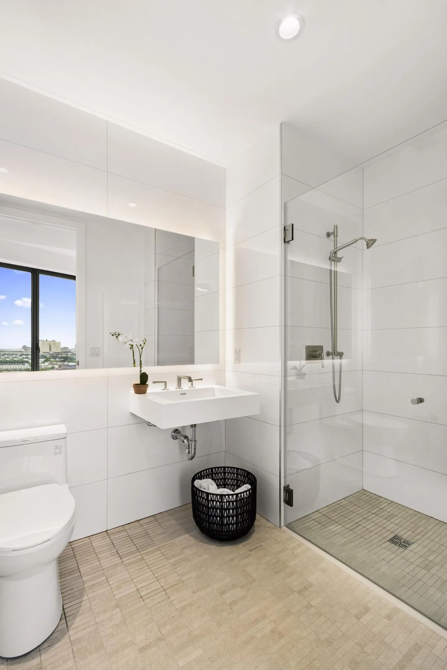 The I line is a three bedroom, two bathroom apartment at the very apex of the building’s stunning angular architecture. With massive floor to ceiling windows throughout the apartment, and an abundance of light from panoramic views of the Brooklyn and Manhattan skylines. The unit features a walk in shower in the primary bathroom (no tub), Blomberg appliance package, breakfast bar, and in-unit washer dryer.