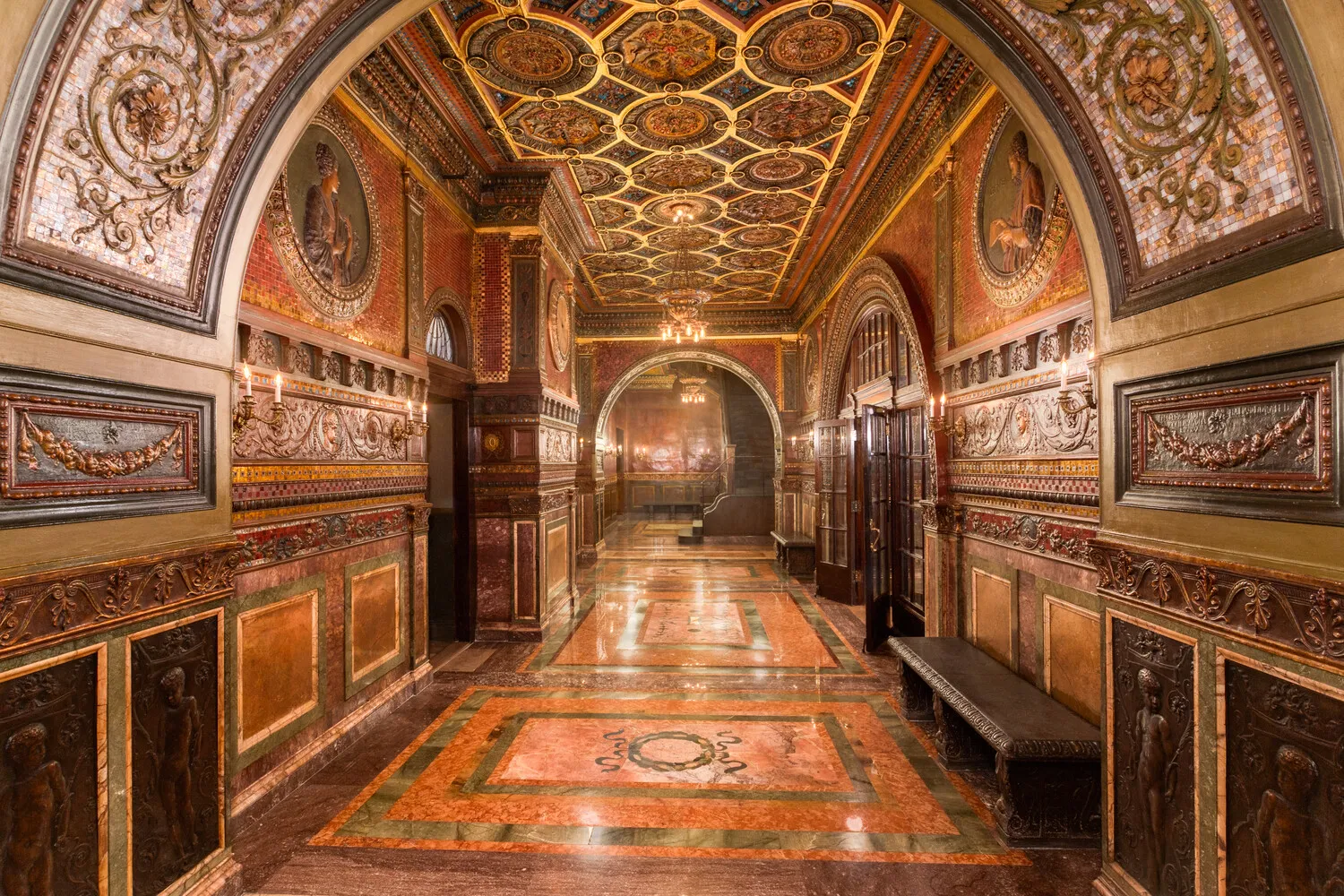 The famed Osborne lobby is a masterpiece in itself, richly decorated in Italian Renaissance and Romanesque Revival styles. Byzantine-inspired details include stucco and mosaic-tiled walls, intricate artistic tile floors paired with varicolored Italian marble slabs, and glazed terracotta Della Robbia panels adorned with deep reds, blues, and gold leaf that grace the walls and ceilings.