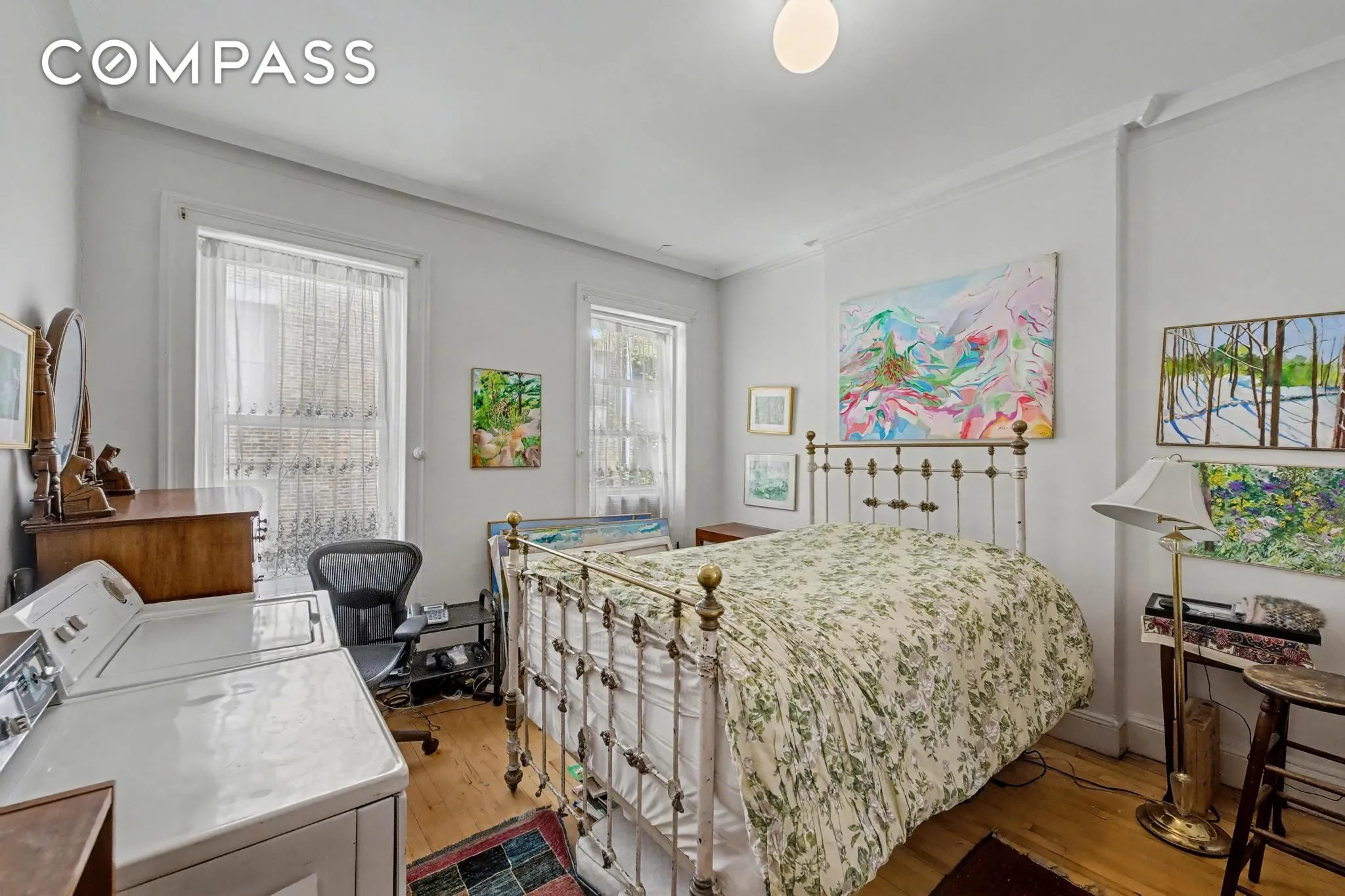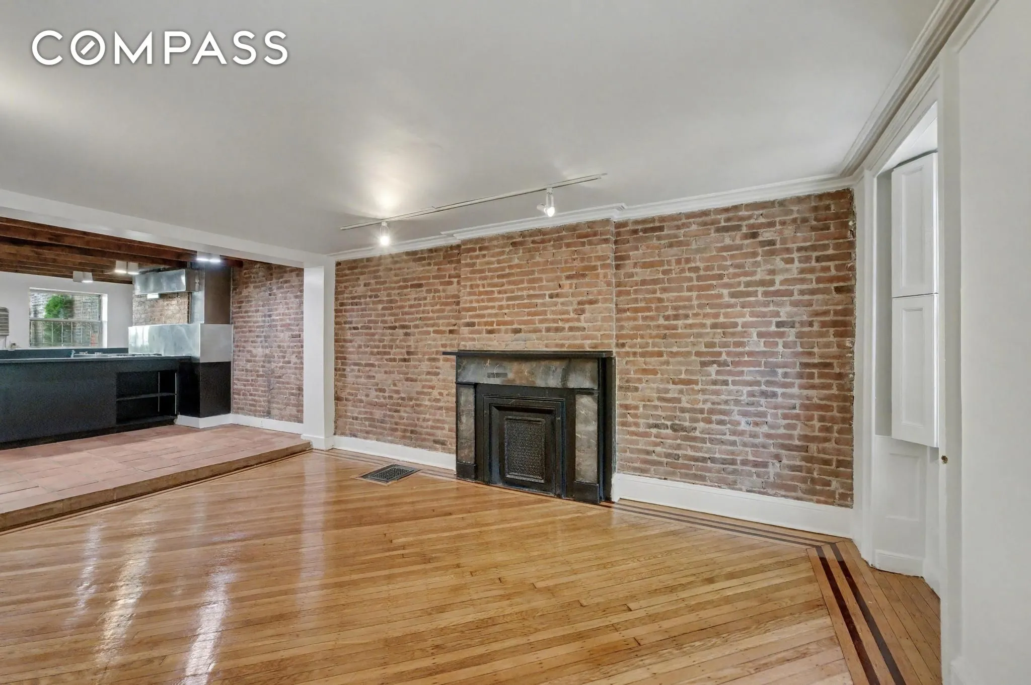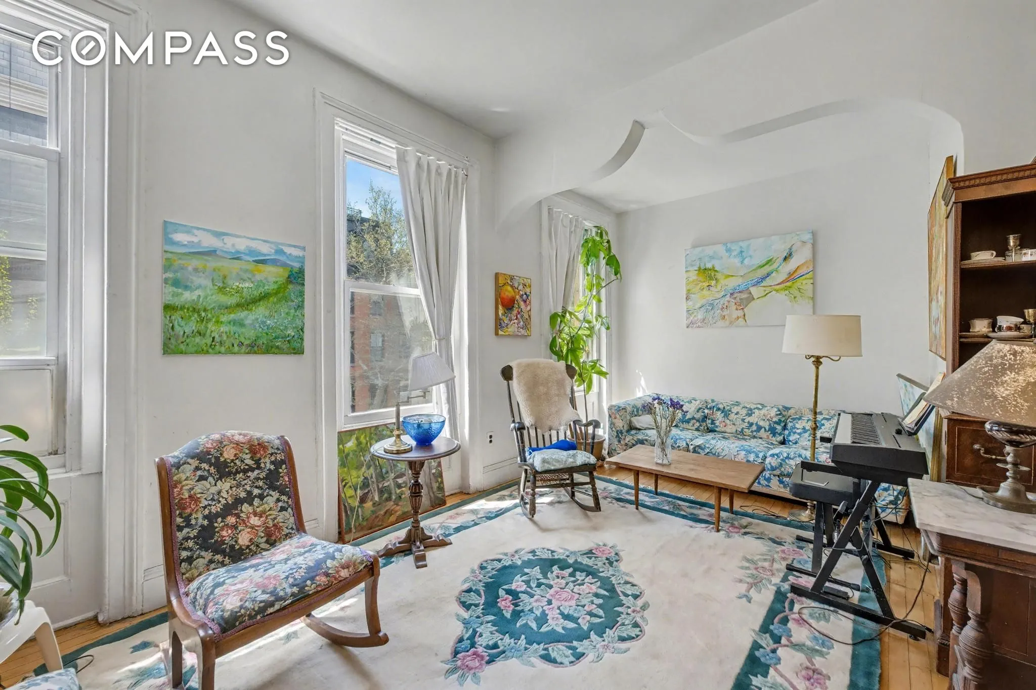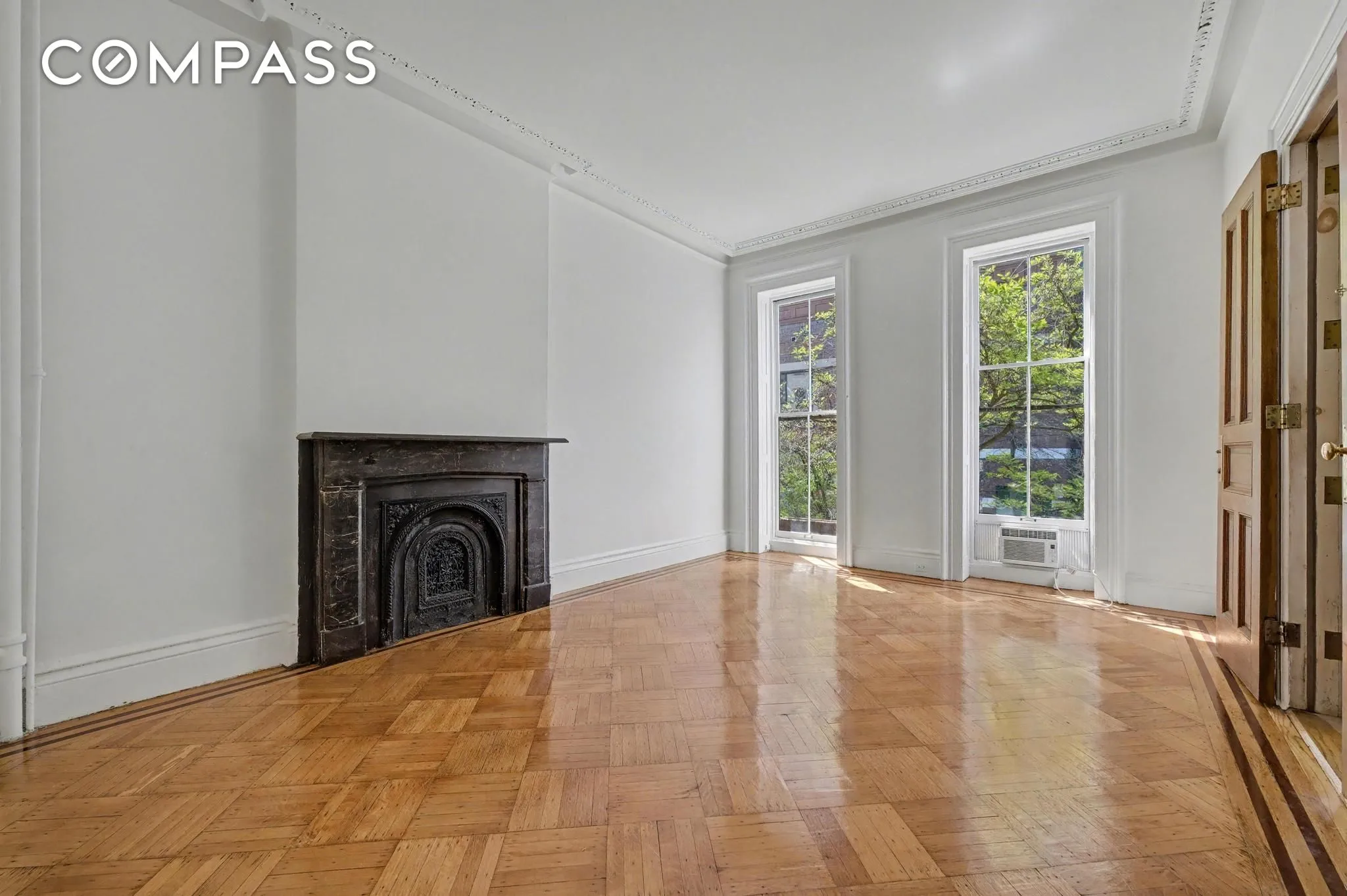 The upper floors house two bright, floor-through apartments overlooking the garden. The second floor unit has a gracious eat-in kitchen and large living /dining area with a warm bedroom and full bathroom. The third floor unit is currently configured as a 2 bedroom unit with a large living room, kitchen and full bathroom. Throughout the building, the historic character is preserved by hardwood floors and multiple original marble fireplace mantels.