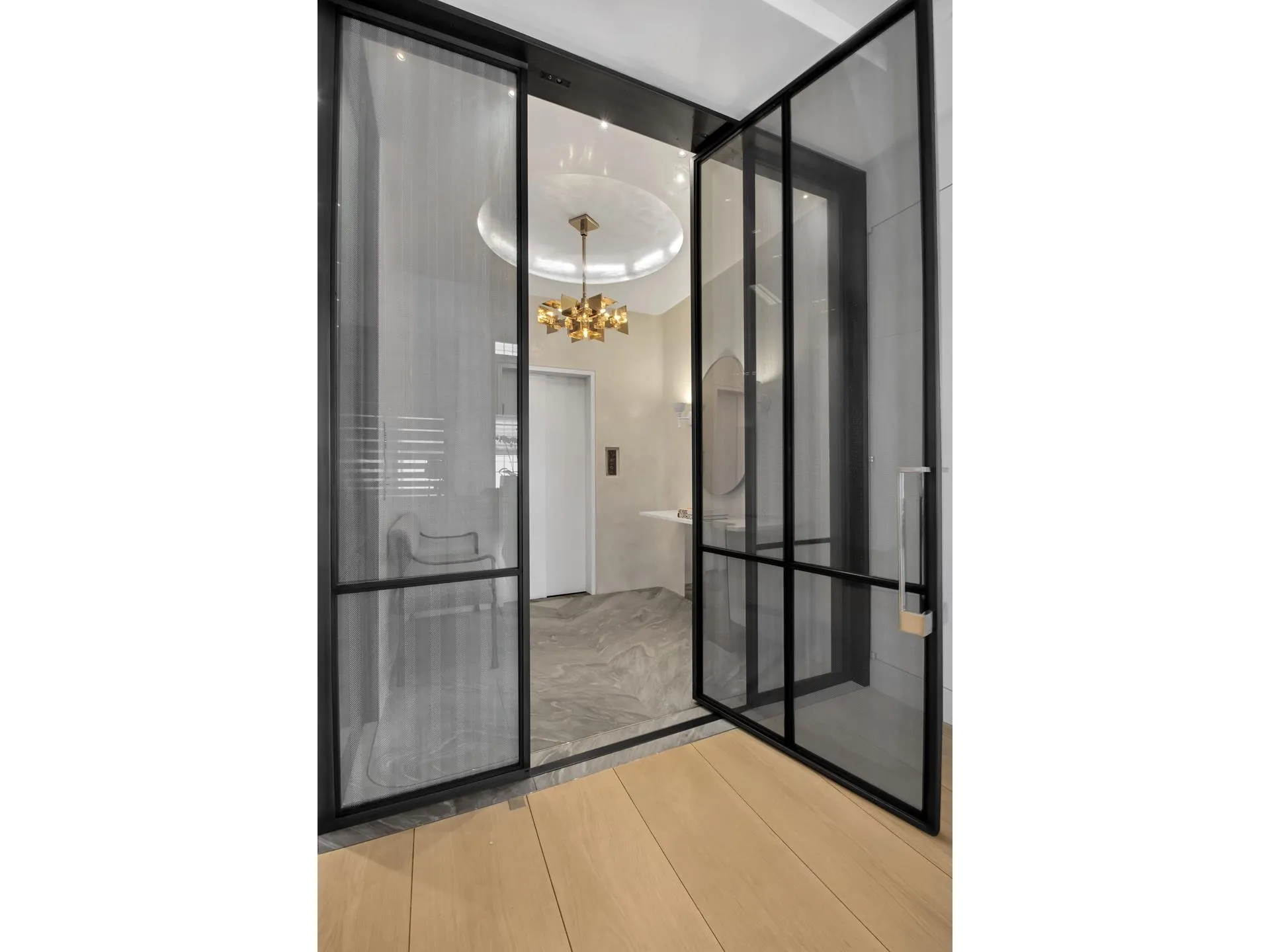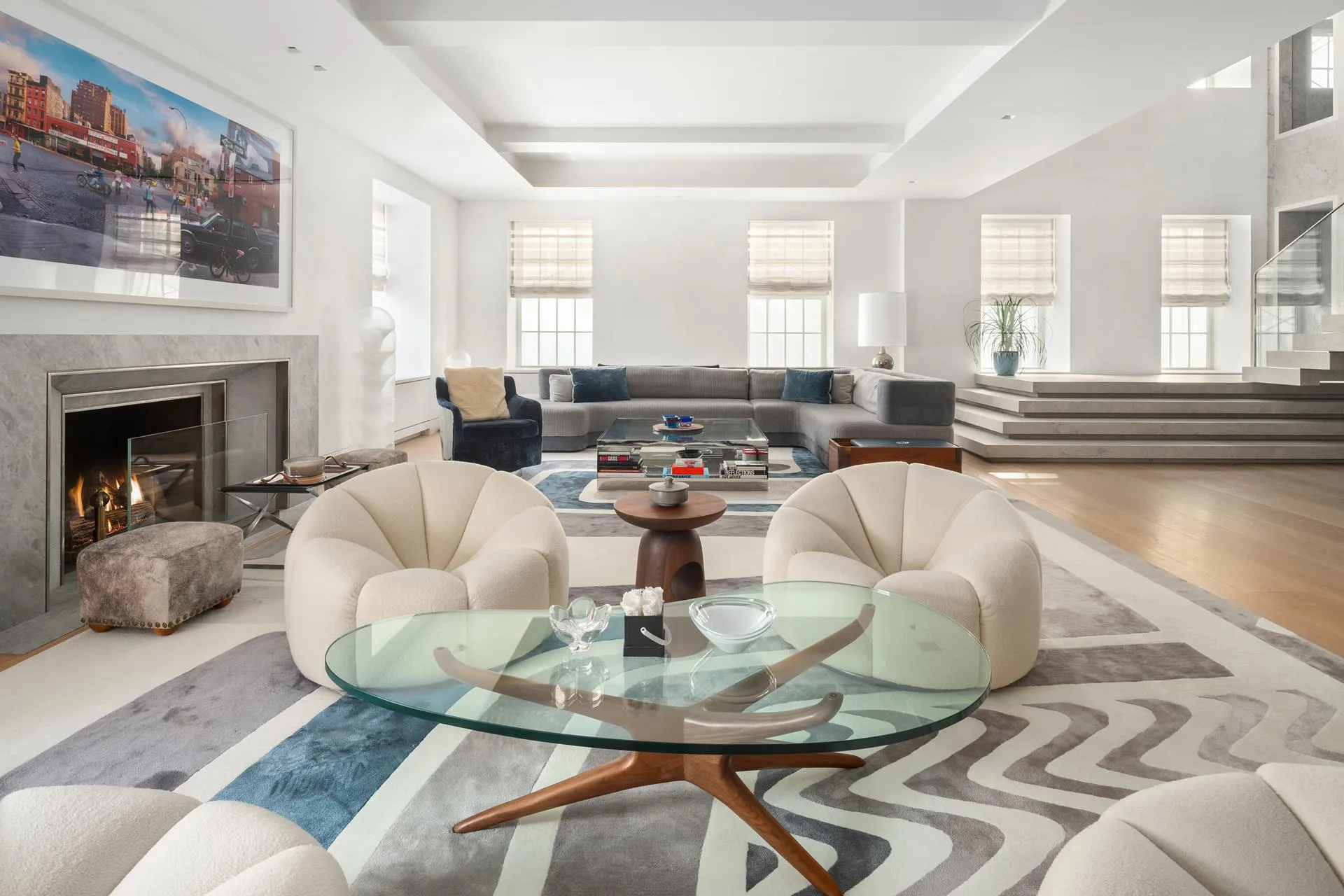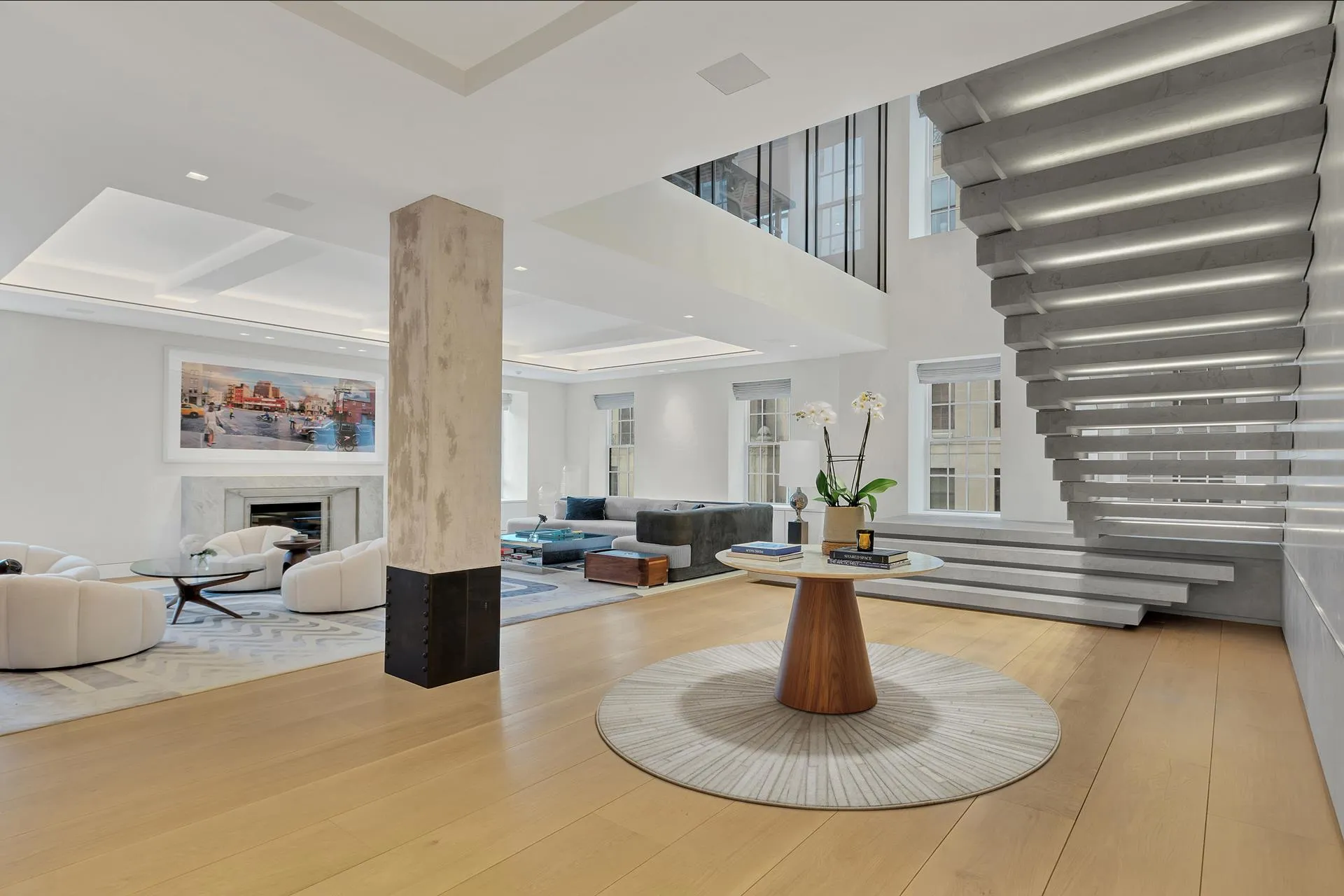 Enter on the 10th floor from a private elevator landing that opens into a glass vestibule which leads to a gorgeous gallery and living room with a wood-burning fireplace and double-height ceilings. An impressive, cantilevered limestone staircase with a floating glass railing is a work of art. It provides a focal point and access to the private quarters on the second level, which can also be accessed via elevator. Beyond the living room is a handsome library clad in ceruse oak with a wood-burning fireplace and wet bar.