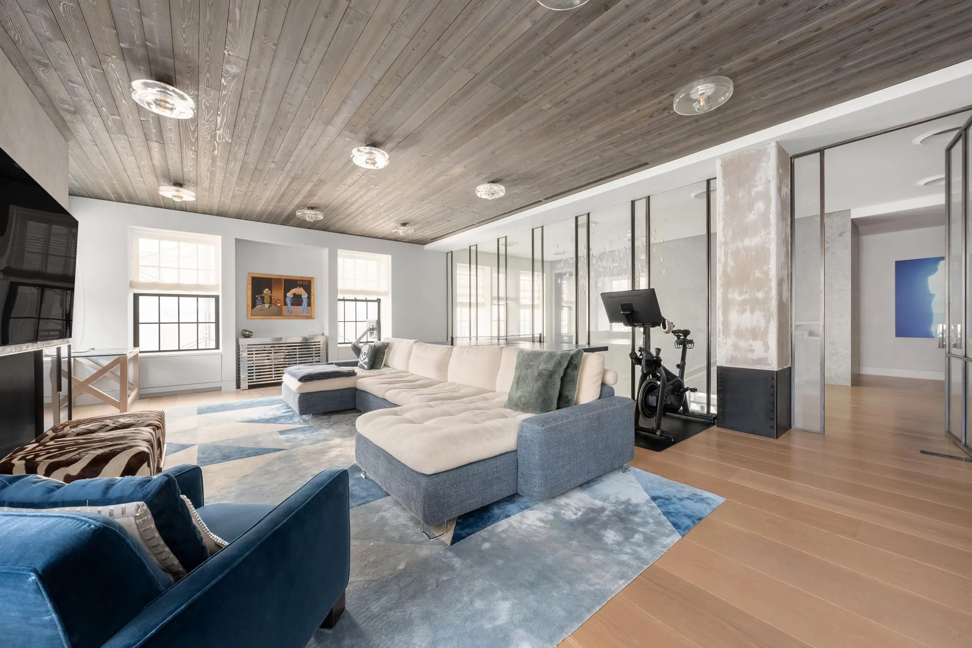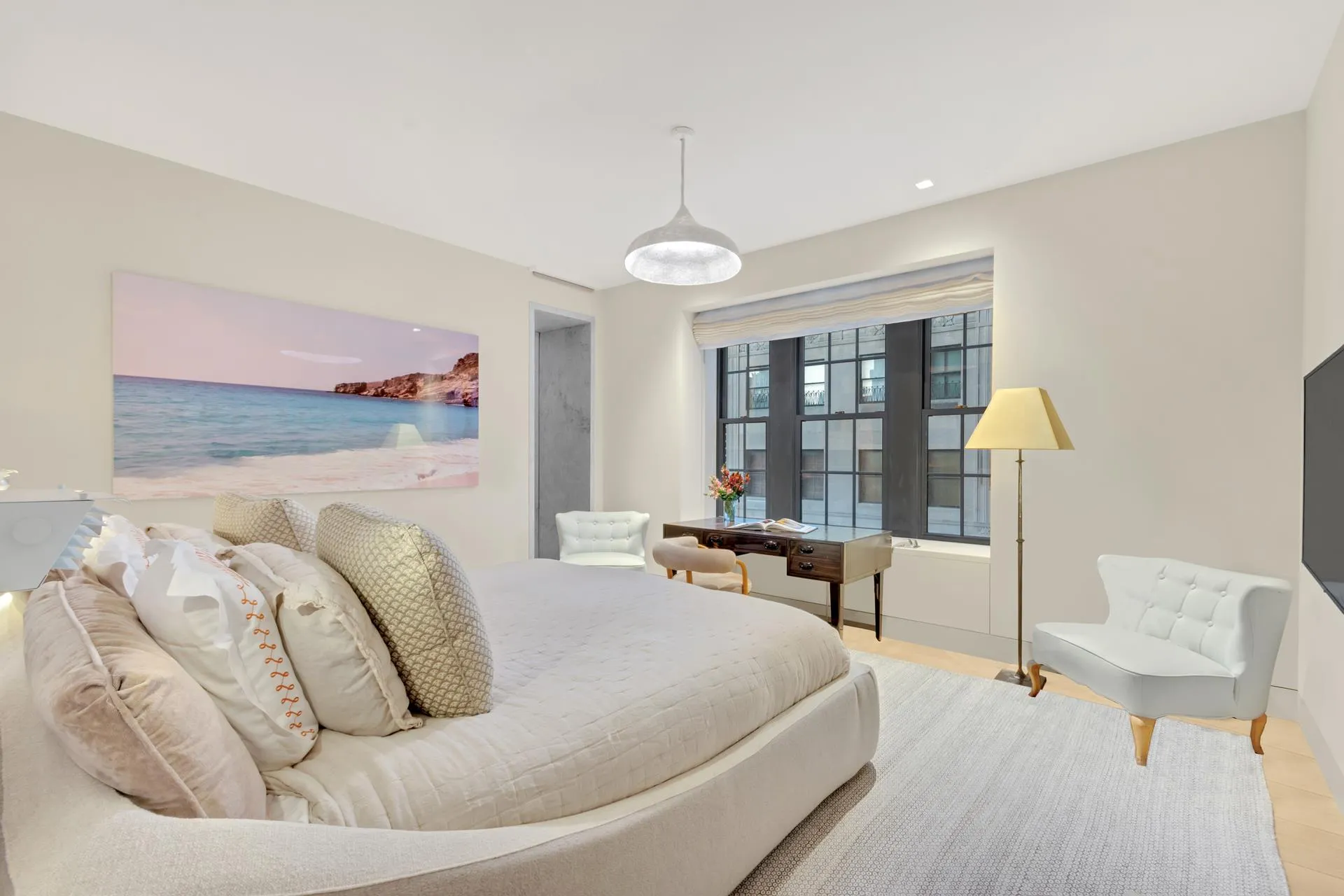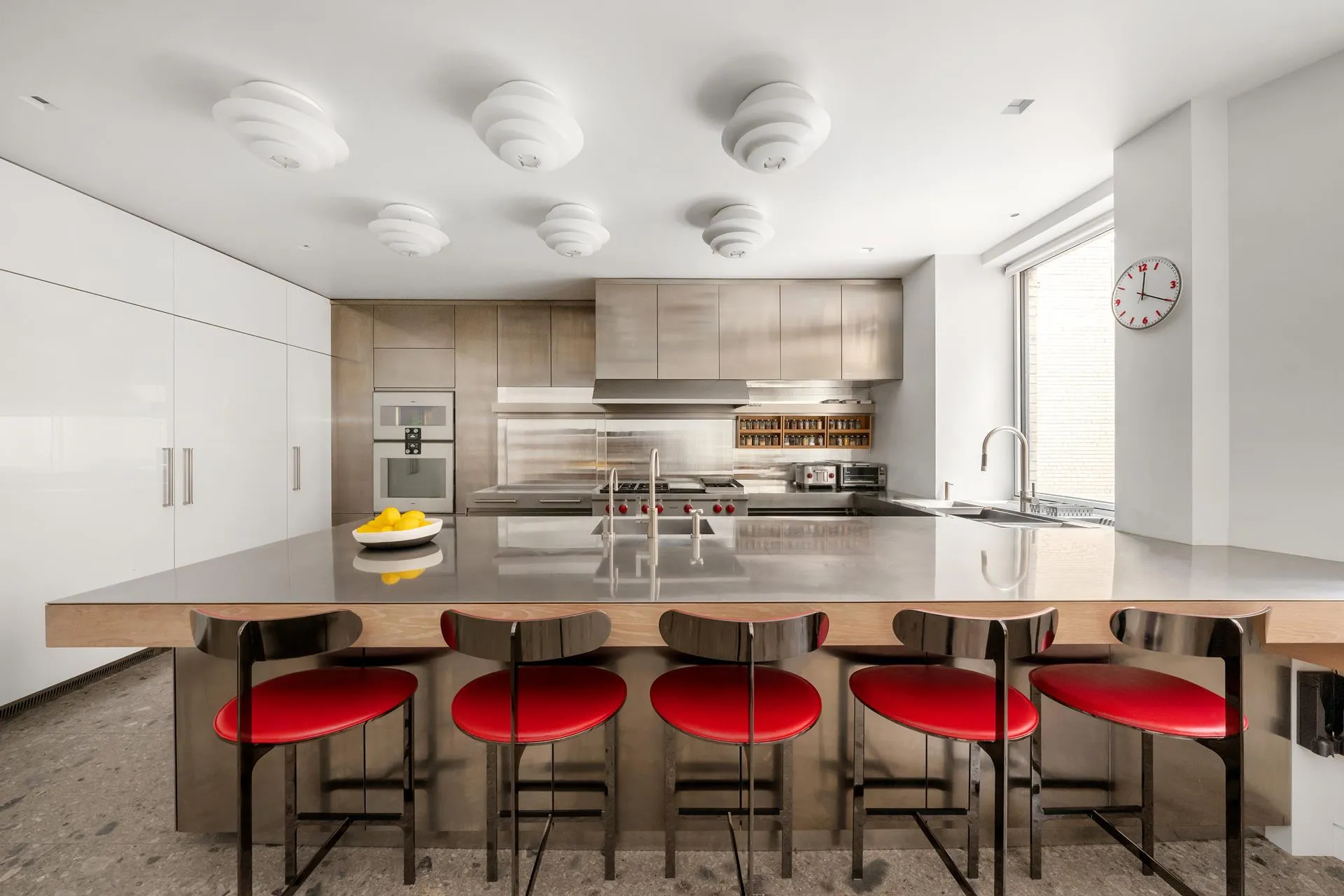 Enter on the 10th floor from a private elevator landing that opens into a glass vestibule which leads to a gorgeous gallery and living room with a wood-burning fireplace and double-height ceilings. An impressive, cantilevered limestone staircase with a floating glass railing is a work of art. It provides a focal point and access to the private quarters on the second level, which can also be accessed via elevator. Beyond the living room is a handsome library clad in ceruse oak with a wood-burning fireplace and wet bar.