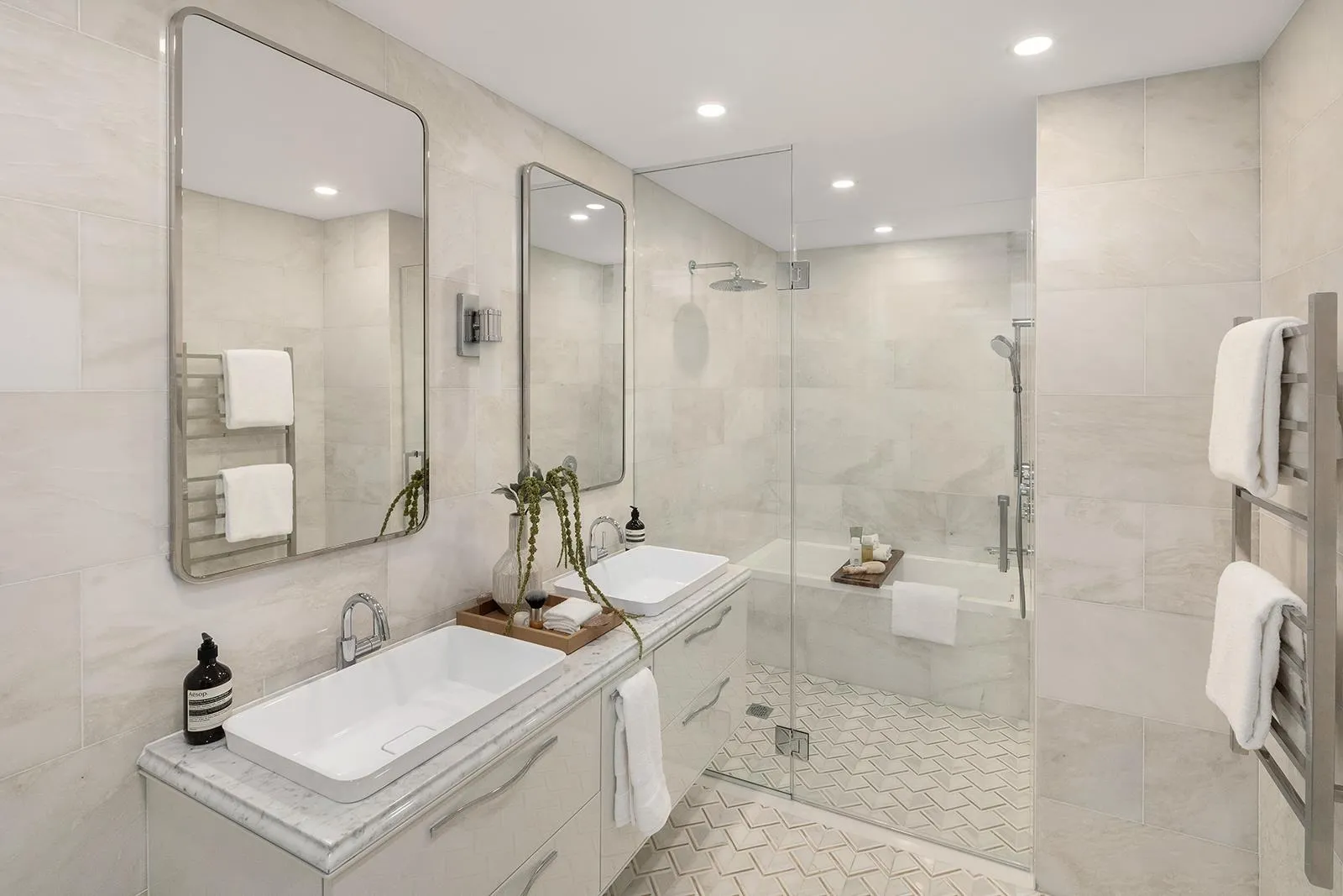 The tranquil primary bedroom suite features dual custom closets, while the en-suite five-fixture bathroom, clad in white marble, features an elegant Scavolini vanity with Carrera marble countertops, a Centerpiece free-standing soaking bathtub, and Robern medicine cabinets. Radiant heated flooring and a towel warmer provide additional comforts.