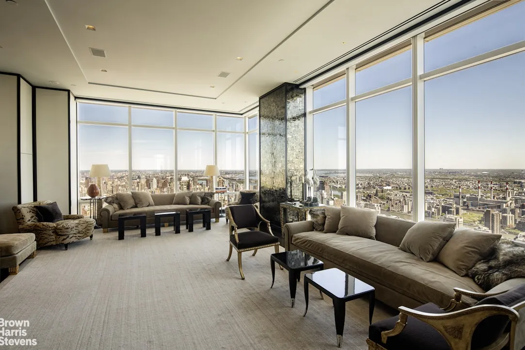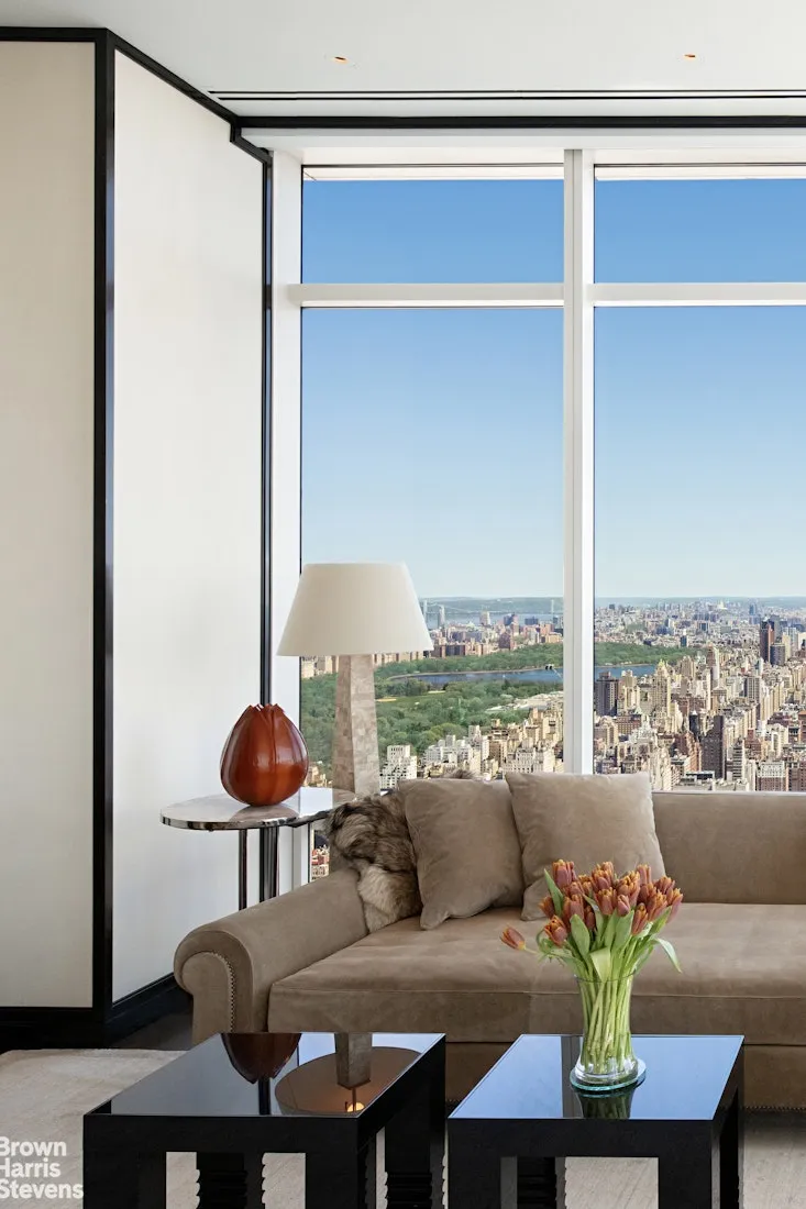 Perched on the 54th floor of One Beacon Court–New York’s most prestigious modern landmark with a private circular driveway, designed by renowned architect Cesar Pelli–this stunning penthouse, masterfully crafted by internationally acclaimed interior designer Jacques Grange, occupies the coveted front corner and offers commanding panoramic views. Forty floor-to-ceiling windows and soaring ceilings frame breathtaking vistas of the city and beyond. Light floods every room, highlighting bespoke design details and creating a sense of airy elegance throughout.