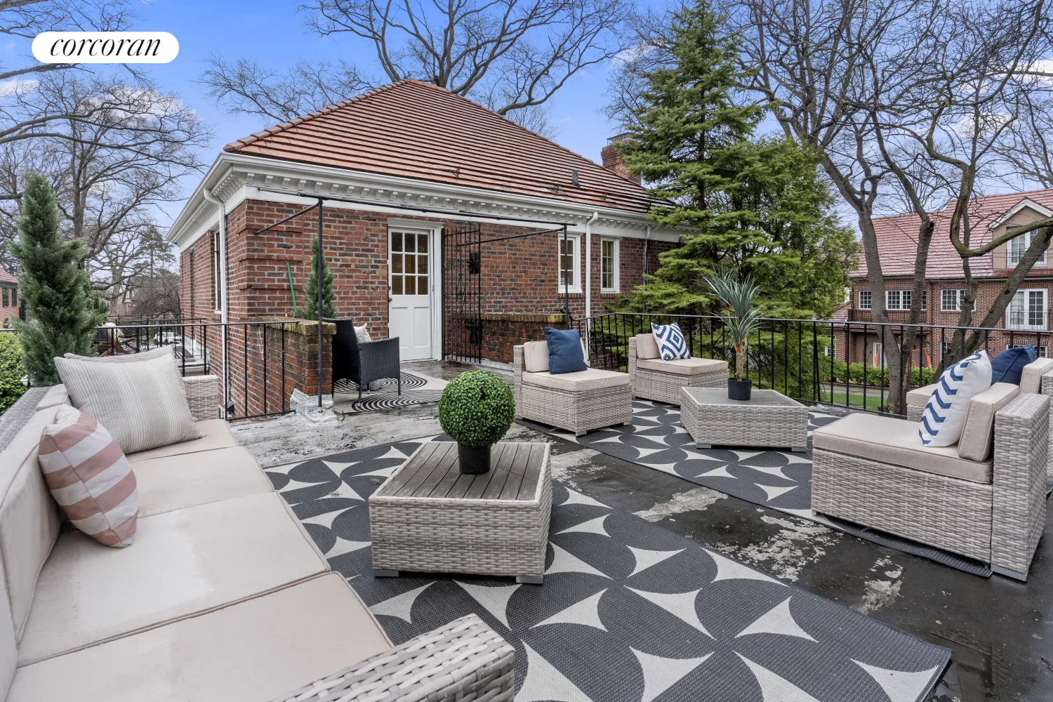 Ascend the elegant, open curving staircase to a spacious landing that introduces the luxurious primary suite. Here, a fully renovated ensuite bath with a two-person shower and a generous walk-in closet await. Two additional bedrooms, each with its own private terrace offering verdant views, a full bath, and a charming nursery with a Juliette balcony (perfect as an office or exercise room) complete the second floor. The expansive rear terrace, a remarkable 350 sq ft, is an outdoor sanctuary, while the side terrace overlooks the lush south lot.