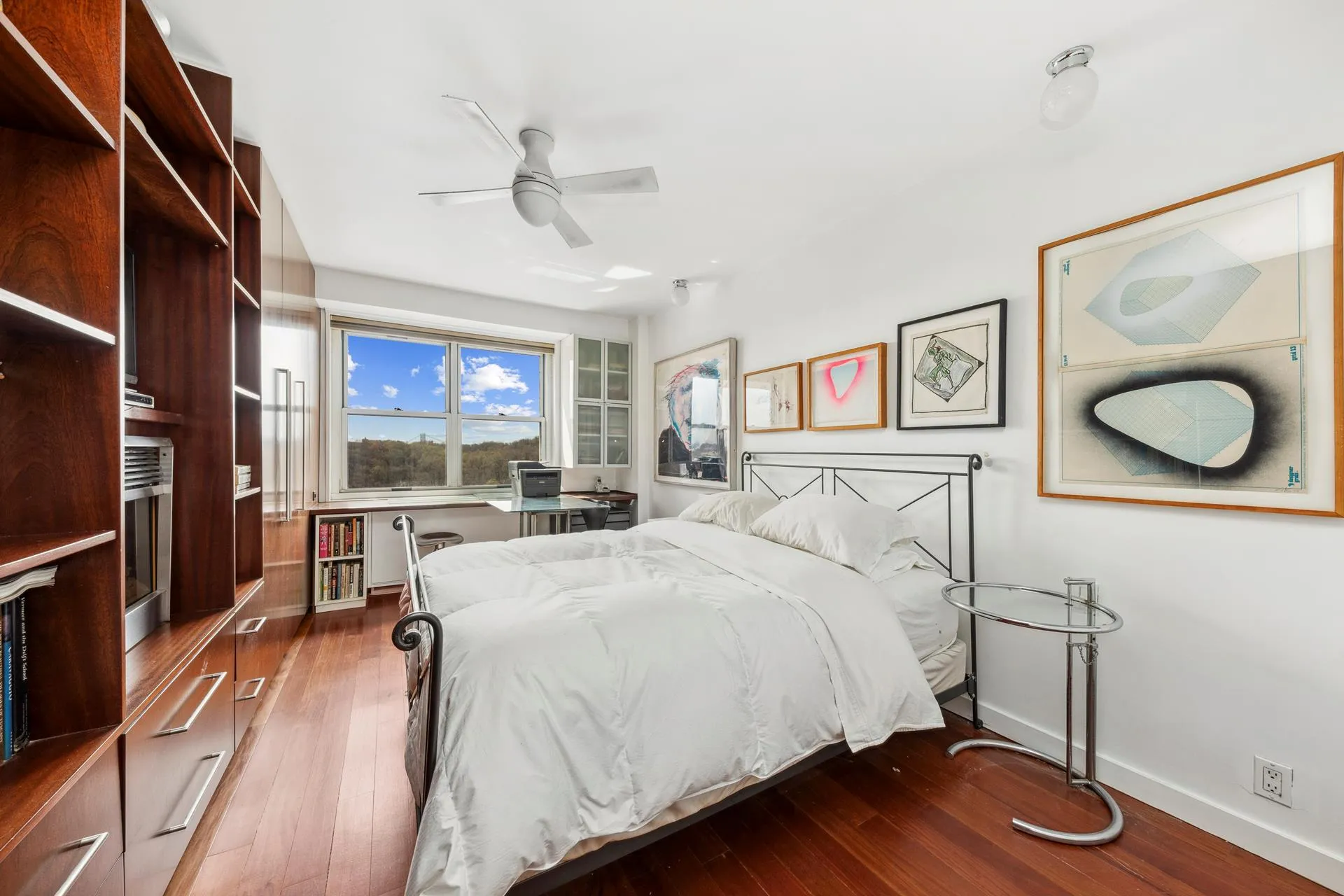 As you enter the apartment, you’ll be greeted by an open floorplan along with a generously sized foyer boasting three deep closets with tall, elegant doors. Continue into the large, spacious living area and take advantage of its unique feature of over 15 feet of modern glass cabinets for books and other cherished keepsakes. The dining area allows for a sizeable table and the extended open kitchen is a culinary dream with plenty of storage and expansive countertops, as well as magnificent views of the river and park below.