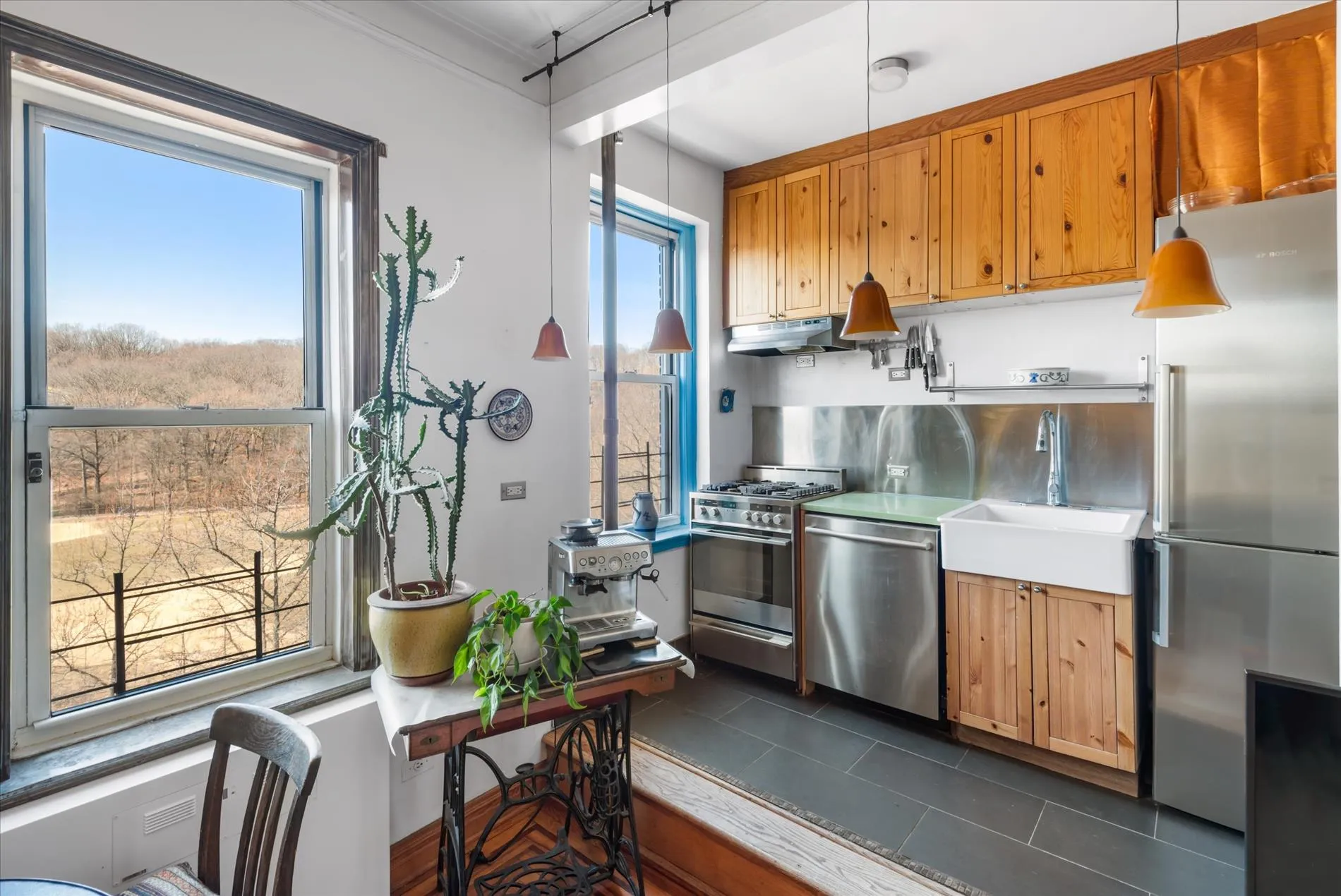The bedrooms are well-proportioned and thoughtfully separated for privacy. The primary easily fits a king-size bed and includes ample closet space. The second bedroom, located on the former studio side, leads to the sunroom—once the studio’s kitchen—offering treetop and park views.
