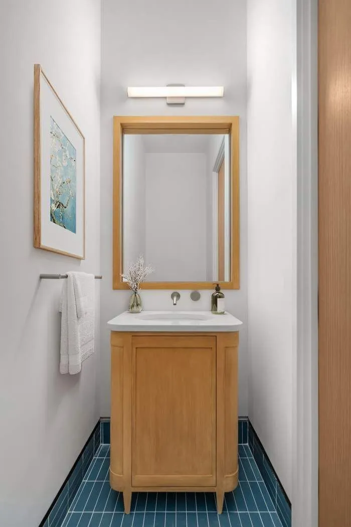 The Workstead-designed kitchen is stylishly separated from the main living area and features a spectacular island with Calacatta Vagli Oro marble and chamfered edges, white maple cabinetry paired with satin nickel hardware, Gaggenau appliances and a separate walk-in pantry. A laundry room with side-by-side LG W/D, and the powder room are discreetly located off the main hallway. The powder room features a custom vanity with a stone top, and Federal Blue tile floors.