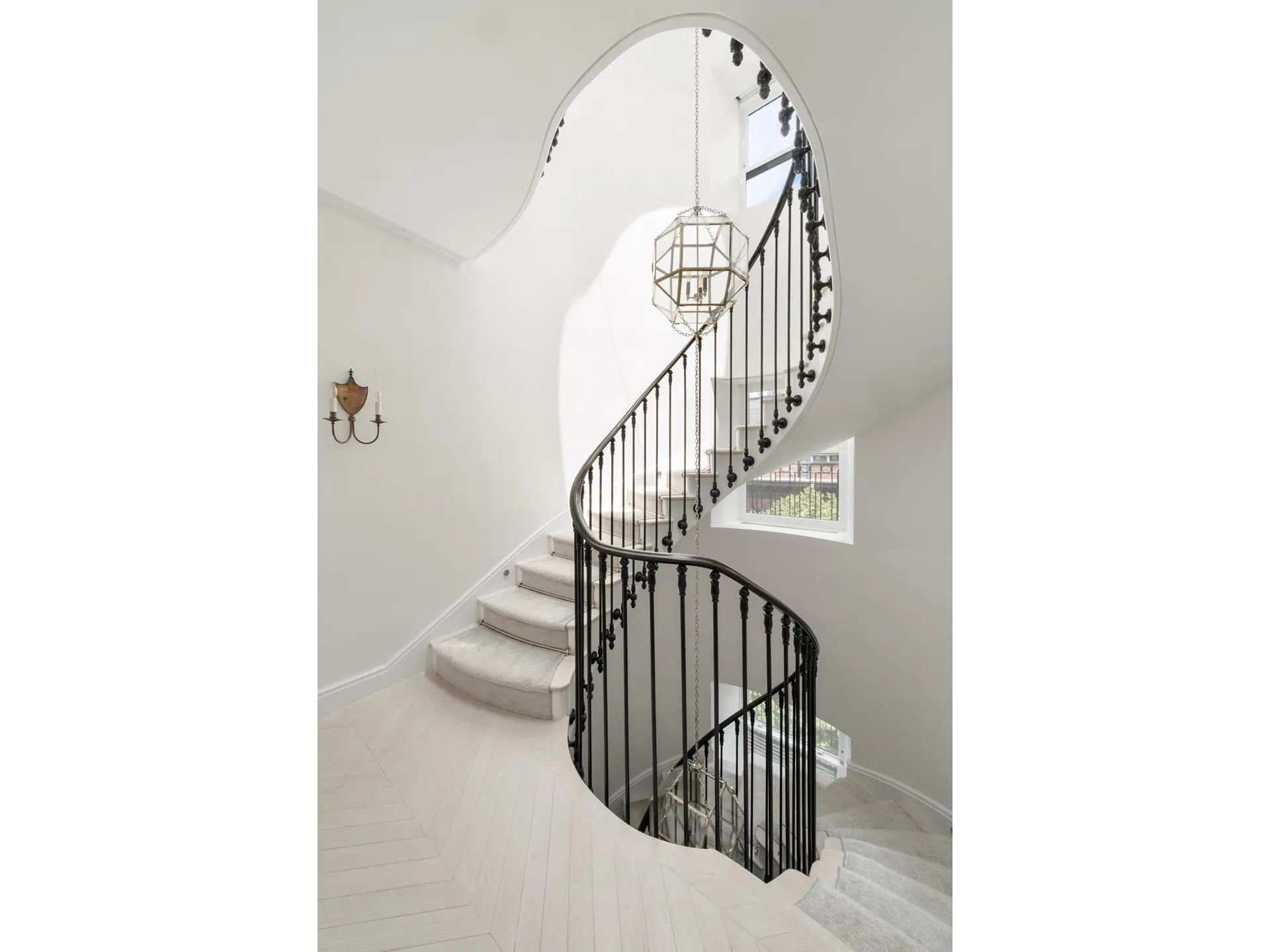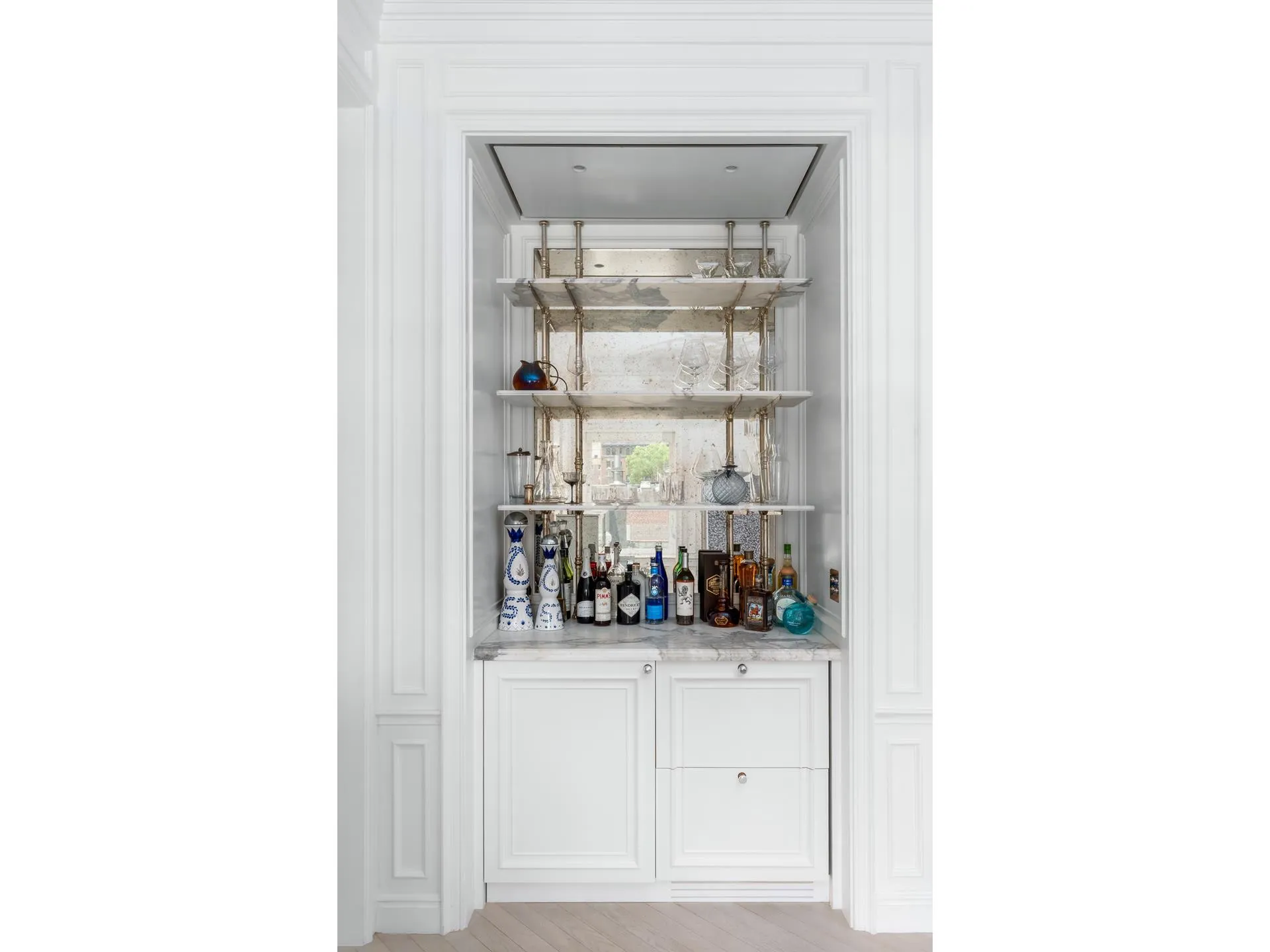No detail was overlooked: soundproof custom windows, Italian plaster walls, elegant paneling with ornate ceiling rosettes, chandeliers from John Rosselli & Associates, and radiant-heated Scandinavian chevron floors throughout. The property boasts full Savant smart home automation, individually zoned central air, and keyed elevator access to all levels. Dedicated storage is included.