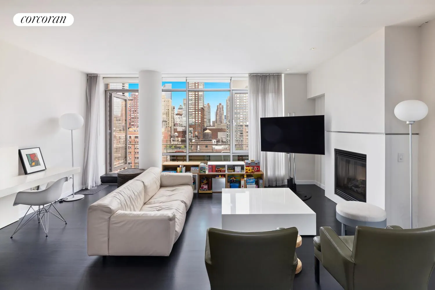 A thoughtful layout separates the bedrooms into distinct North and South wings, offering exceptional privacy and flexibility guests or home office use. The expansive entertaining spaces flow from a gracious living room-featuring high ceilings, a gas fireplace and custom book shelving to a sun-filled South facing family room with its own additional fireplace and a 22-foot landscaped terrace, offering a serene escape with open Upper West Side views.
