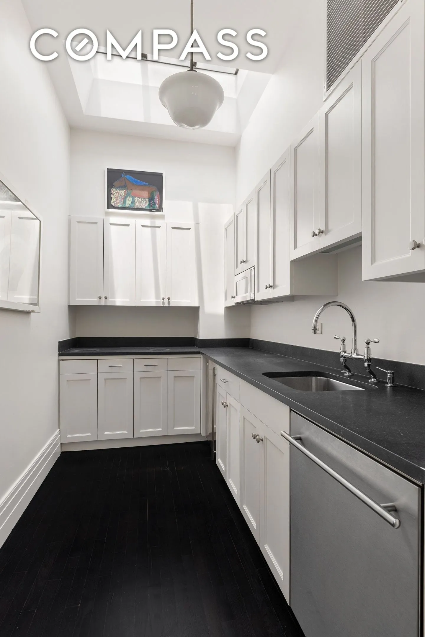 The garden level is the natural heart of the home, with its massive eat-in kitchen, secondary dining room with a skylight, and immaculately landscaped garden. Wall-to-wall and floor-to-ceiling casement windows create an indoor/outdoor illusion and brighten the space. The kitchen is a showstopper with long glassos countertops, an enormous quartzite island with bar seating for four, endless wood cabinetry for storage, and a premium appliance package from Sub-Zero, Miele and Thermador.