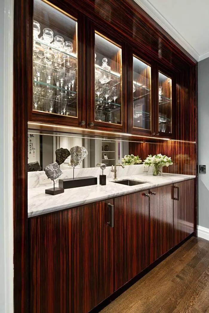Accessed by a private elevator landing, the impressive Gallery, 27 feet in length, opens to three splendid entertainment rooms. A vast Living Room and adjacent Library, each with a wood-burning fireplace, face east over Park Avenue and are flooded with sunlight. Nearby, a formal Dining Room is ideal for entertaining. Beyond, the eat-in chef’s kitchen is perfectly appointed with a panoply of state-of-the-art appliances, banquette and island seating, and very plentiful storage, and is supported by a separate laundry room. Completing this level, a large informal Den and an efficient Office are welcome additions, and a conveniently located wet bar and stylish powder room ensure seamless entertaining.