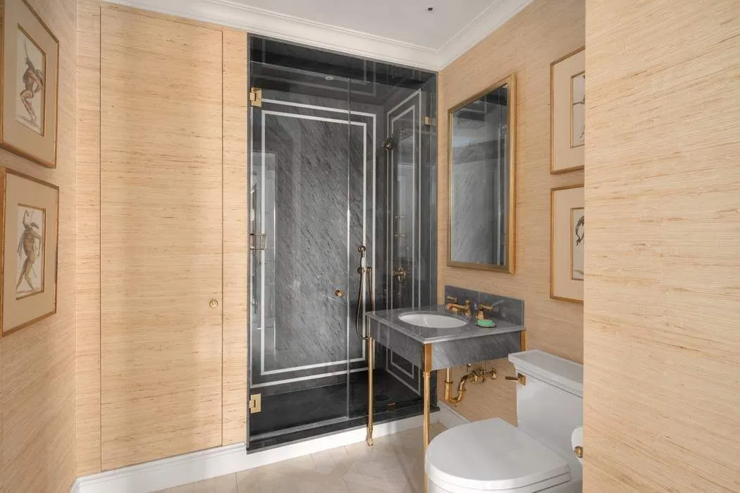 The primary suite evokes the tranquility of the countryside whilst in the heart of the city and is filled with soft natural light throughout the day. The oversized primary bath features a walk-in shower, a separate soaking tub, and refined finishes that create a serene, retreat-like atmosphere. Large squares of Thassos marble were meticulously cut and laid with minimal grout joints, ensuring precise alignment and a clean, elegant look.