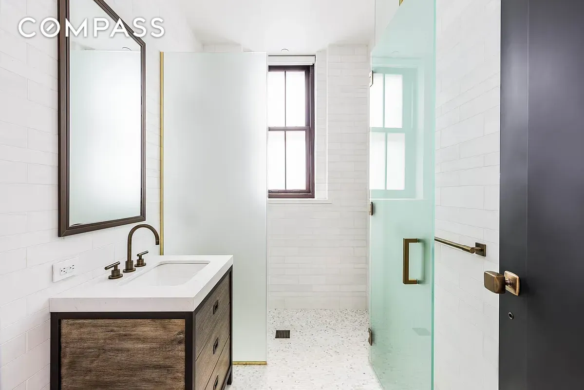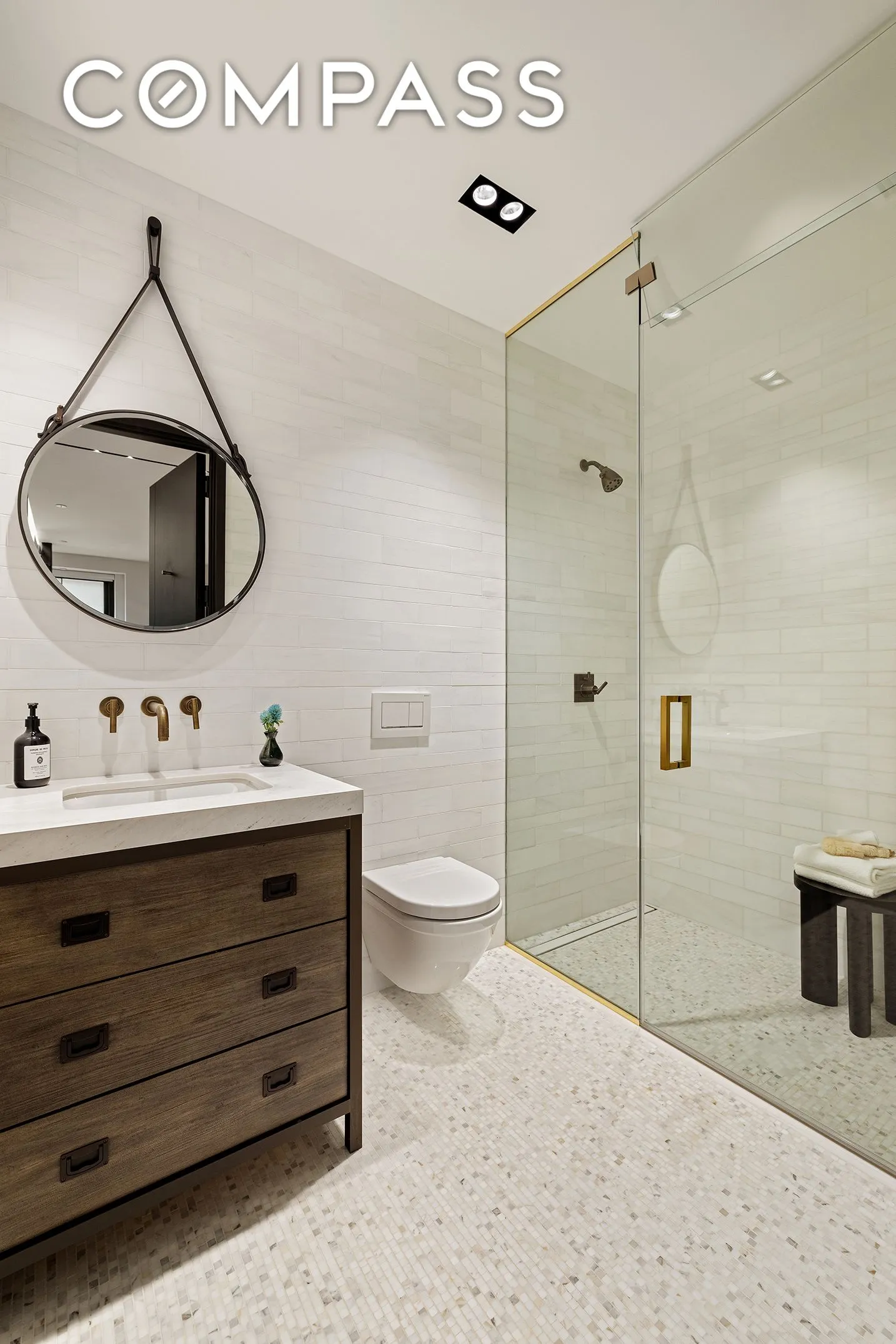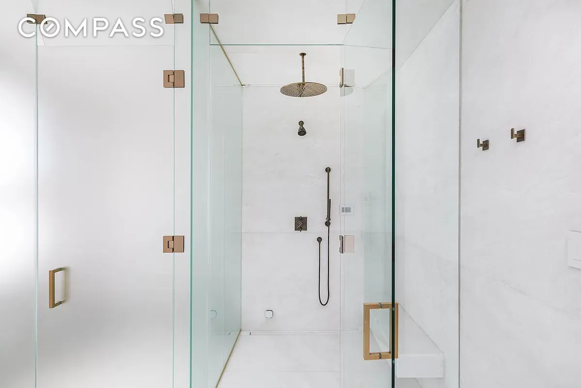 The second level is anchored by the sun-filled primary suite, with multiple closets and a spa-like bath wrapped in Italian Calacatta marble. A freestanding soaking tub, glass-enclosed steam shower with rain dome and body sprays, radiant heated floors, dual bronze vanities, and a separate wash closet with bidet. This level also hosts another en-suite bedroom and a flexible den or easily a fourth bedroom, plus an additional full bath.