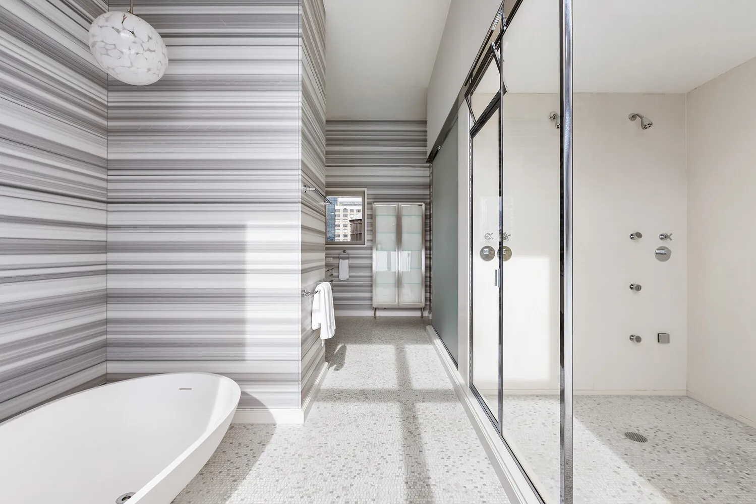 A private coded elevator opens to a gracious entry gallery with two points of entry into the home. Upon entering through the main door, you are greeted with expansive art walls, custom lighting, Italian porcelain floors, and hand-applied plaster walls. Comfort is enhanced throughout by radiant in-floor and in-wall heating and a fully integrated humidification system.
