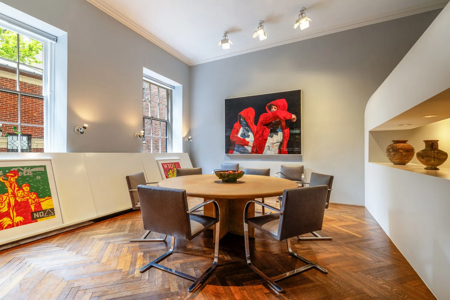 The custom-designed, sculptural alcove sitting area creates a seamless transition between the grand living room and the formal dining area. The dining room, an almost perfect square, features impressive gallery walls, providing an exceptional showcase for significant art pieces, and is ideally located next to the large modern eat in kitchen.
