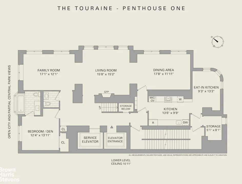 Featuring 50 linear feet across the den, living, and dining rooms, coupled with a ceiling height of nearly 11 feet, the main floor enjoys stunning views to the north, east, as well as west toward Central Park. A gourmet kitchen features honed Italian Calacatta marble, several Gaggenau appliances, and a beautiful windowed eat-in, breakfast area. The refrigerator and wine fridge are by Subzero. The main floor also boasts a den, which can serve as a guest room, complete with an ensuite windowed bathroom, and a fantastic powder room.
