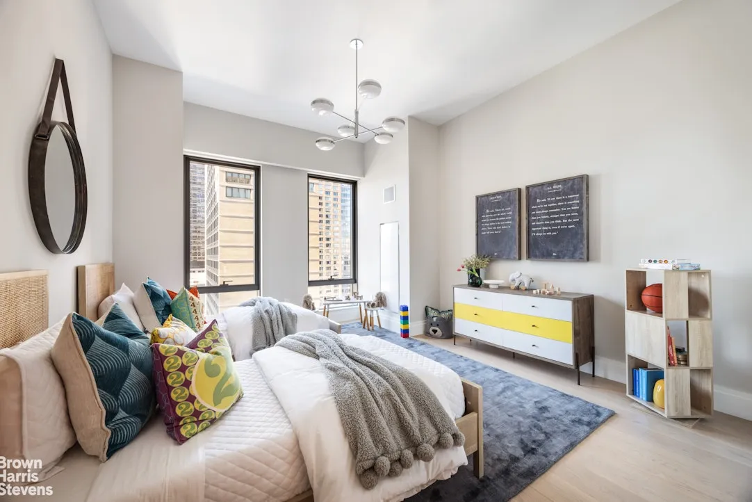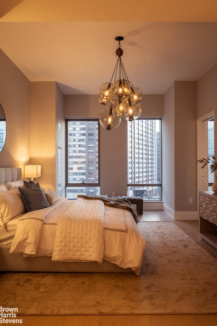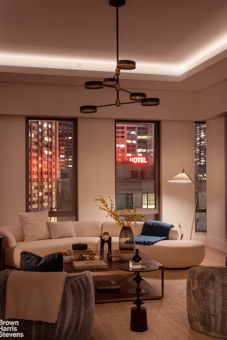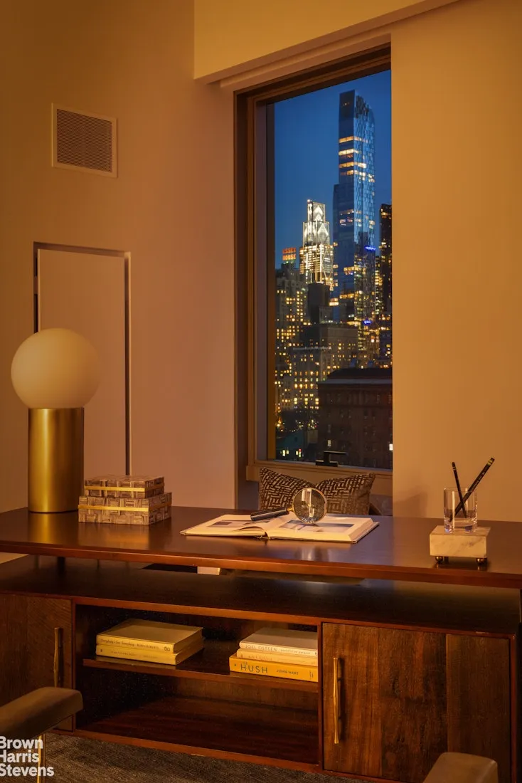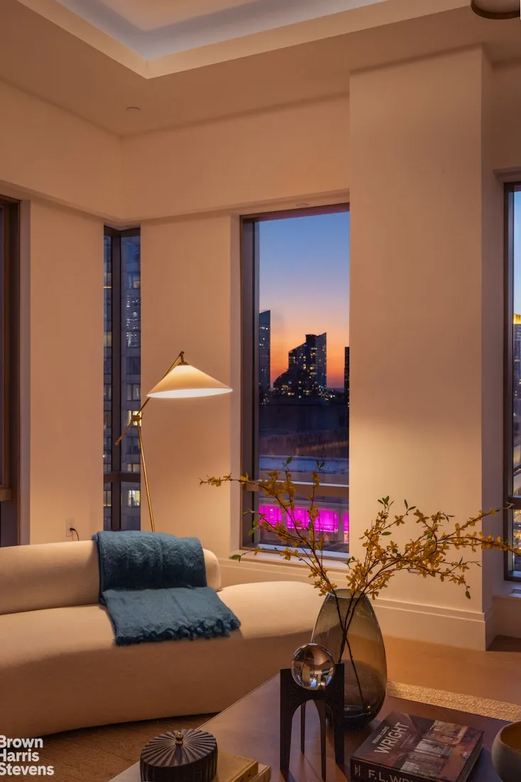 Set on the 17th and top floor of the House section, the residence offers 4 to 5 bedrooms and 5.5 bathrooms and balances architectural sophistication with livable warmth. Expansive planes of floor-to-ceiling glass facing west, south, and southeast introduce dramatic vertical volume and allow light to travel throughout the home from morning through sunset. By evening, the residence glows with the lights of Lincoln Center and the surrounding cityscape.