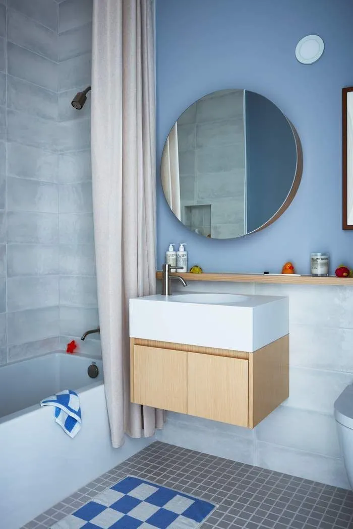 Located off the foyer, the hallway to the secondary bedrooms leads to the white maple-clad powder room with hidden mirror and custom bronze fantasy stone pedestal vanity and a concealed closet featuring a LG washer and dryer. Each of the secondary bedrooms look out on to the expansive terrace and have en-suite bathrooms with mosaic flooring, undermount tubs with brushed nickel fixtures, custom maple vanities and round medicine cabinets.