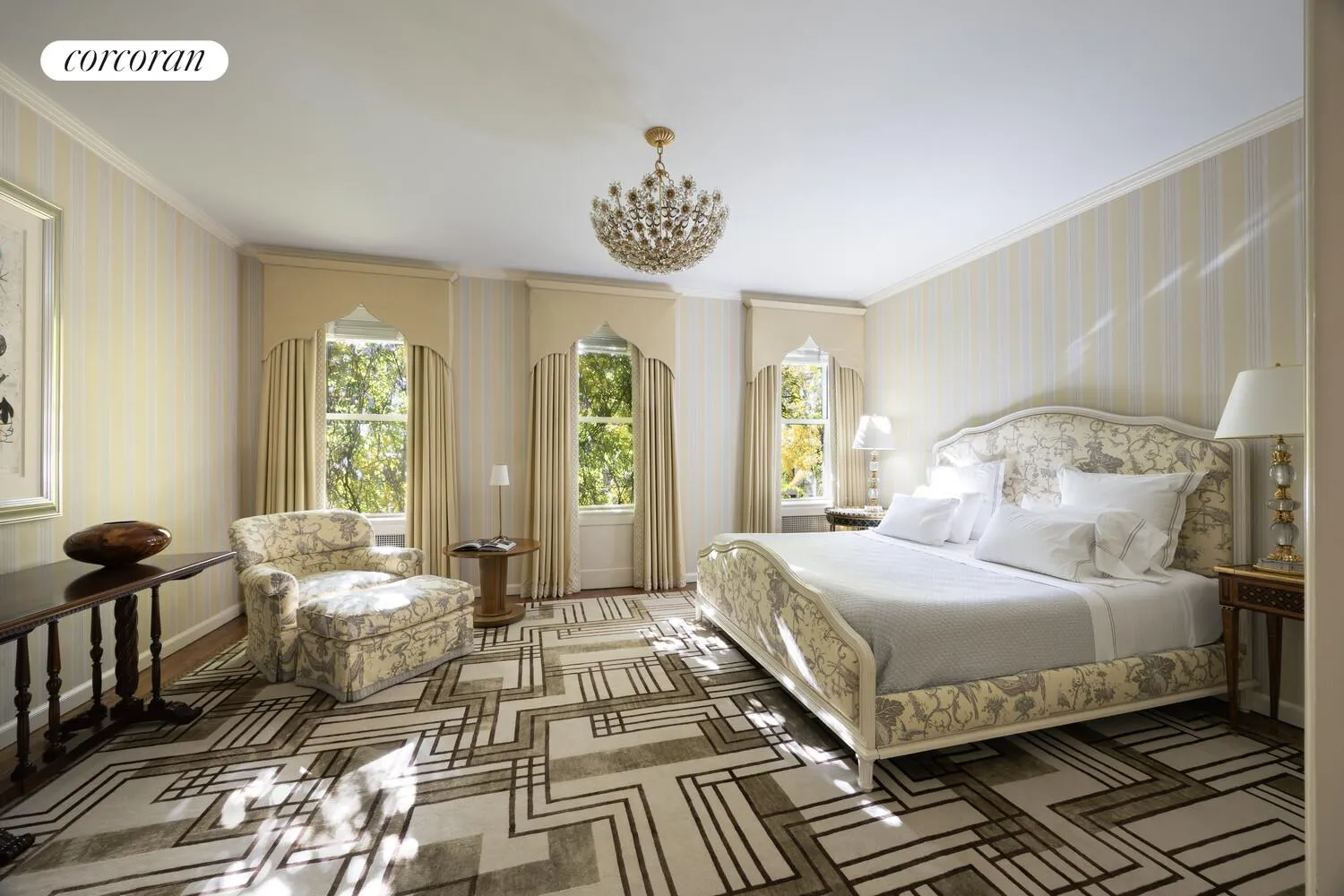 The primary bedroom suite on the third floor stretches across the entire width of the house and overlooks the garden, receiving beautiful Southern light throughout the day. With generous closets and a primary bathroom with large walk-in shower and huge soaking tub, as well as two vanities and a separate water closet, the suite has beautiful views, a fireplace and complete privacy. At the front of the house on this level are two tree-top facing bedrooms, both with ensuite baths, and a shared study space. There is also a very large laundry room on this level.