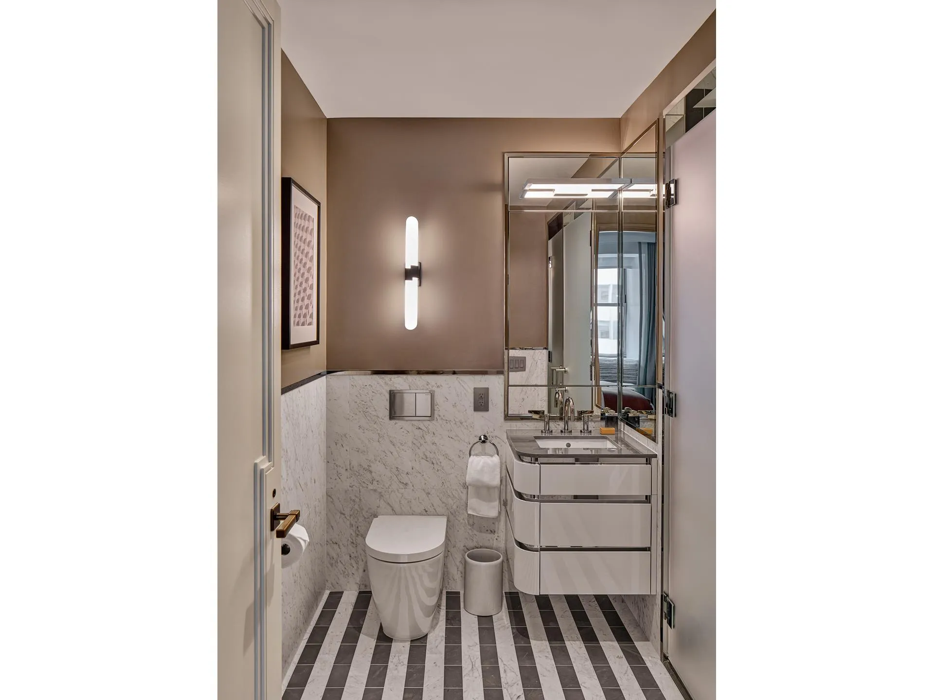 The primary bedroom has a large walk-in closet. The windowed five- fixtured bathroom features floor-to-ceiling honed white Bianca Carrara marble slab walls and radiant heated custom designed mosaic marble tile floor. A custom double vanity with polished Luna Gray marble countertop, elegant stainless-steel legs, and integrated lighting provides exceptional storage complementing the cabinet with integrated lighting, mirror and concealed electric outlet. The freestanding custom designed deep soaking tub offers a thoughtful shelf and sits below a large custom wall mirror featuring fixtures and fittings that are custom forged in polished nickel, exclusively for Waldorf Astoria Residences.