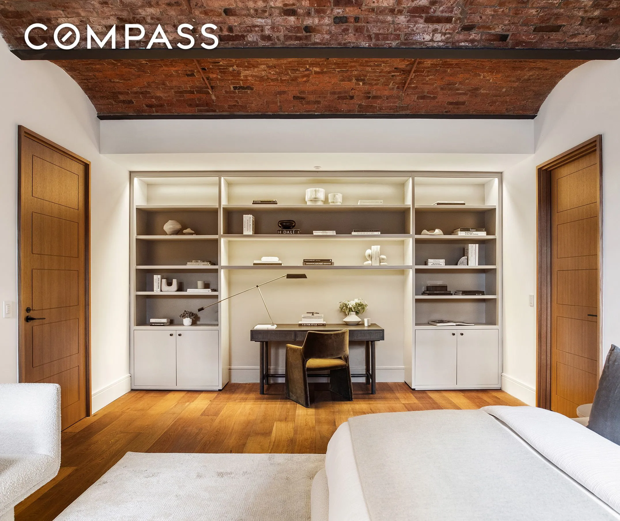 A gracious entry gallery unfolds as a 39-foot corridor of light, lined with windows overlooking the Schumacher’s lush interior garden designed by Ken Smith. This tranquil passage establishes a sense of calm and separation from the city, leading seamlessly into a voluminous great room composed for both living and entertaining. Here, multiple seating and dining zones are bathed in natural light through four deep-set, oversized arched windows with leafy outlooks over Mott Street—an intentionally framed urban landscape that brings greenery and texture into the home year-round.