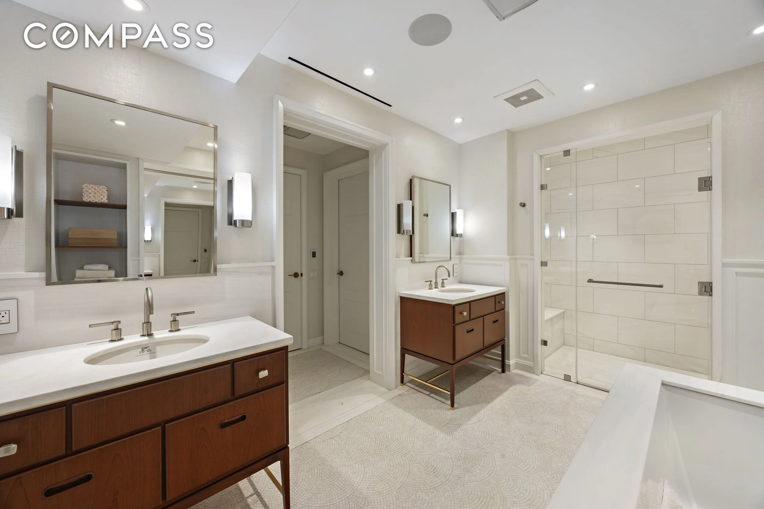The full-floor primary suite is a private retreat with two custom walk-in closets—one fitted with a built-in vanity—and an elegant bath featuring white fan-patterned mosaic tile, a walk-in shower, and a private water closet. Three additional bedrooms, two with en-suite baths, provide comfort and flexibility. One is currently configured as a media room.