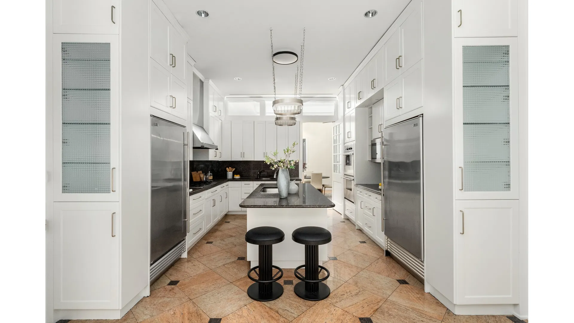 Additional features underscore the property’s caliber: a sweeping central staircase, a newly installed commercial-grade elevator servicing every level, radiant heated floors, a soundproofed media room, advanced mechanical systems, and a comprehensive security system.