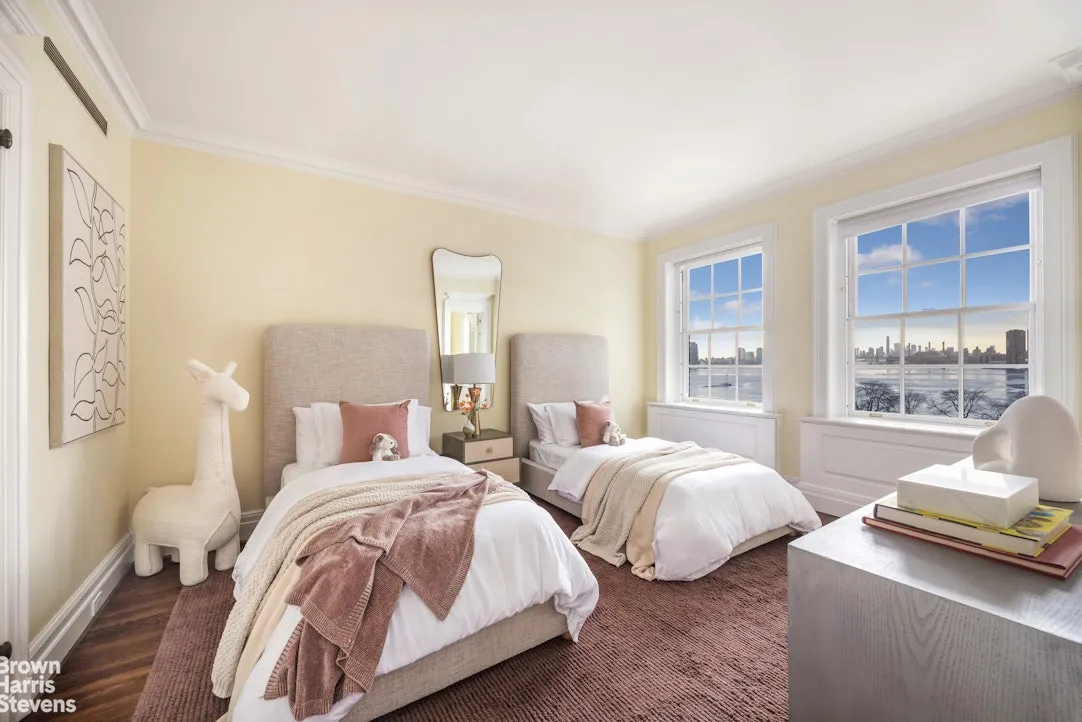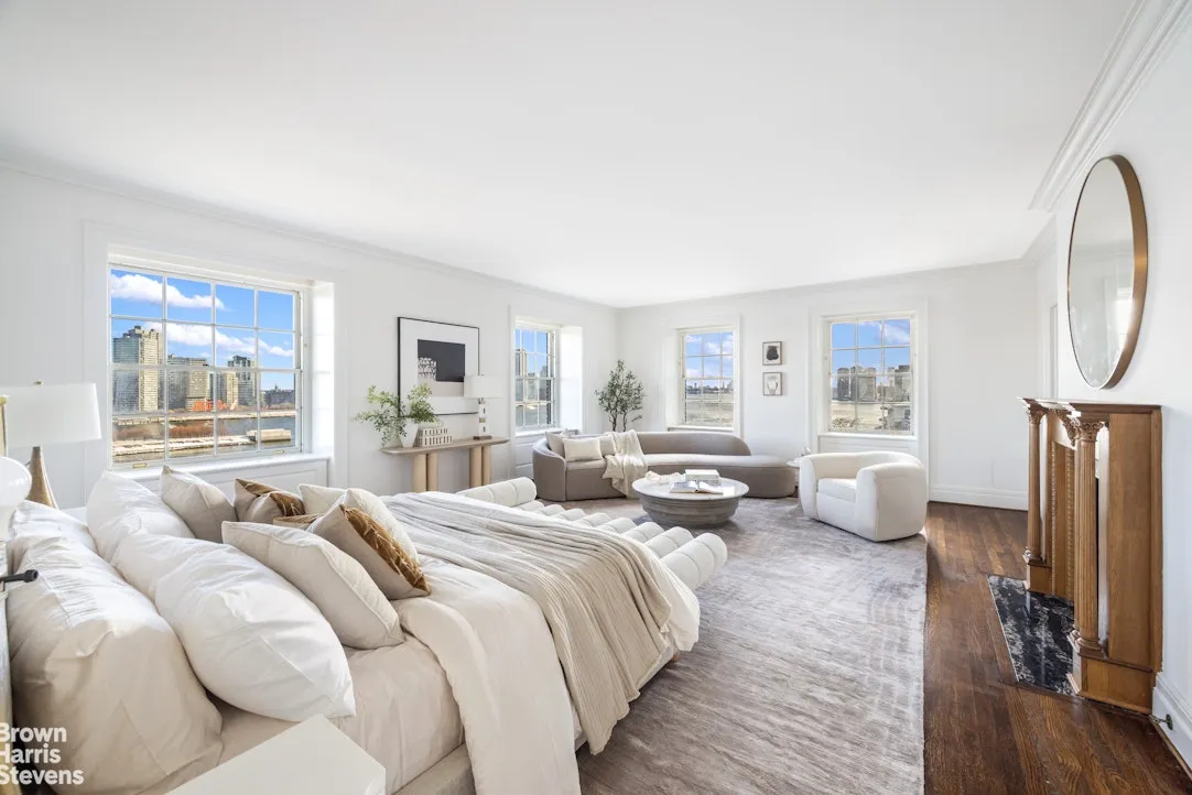 From the extra wide and elegant staircase up to the bedroom floor, the entire primary suite encompasses the side of the apartment overlooking the East River. The corner primary bedroom suite is enormous with its own sitting room, multiple walk-in closets, and two fully windowed bathrooms. The rest of the 8th floor consists of three bedrooms, a yoga room, laundry room and then the former staff quarters which could be another large bedroom suite for guests.