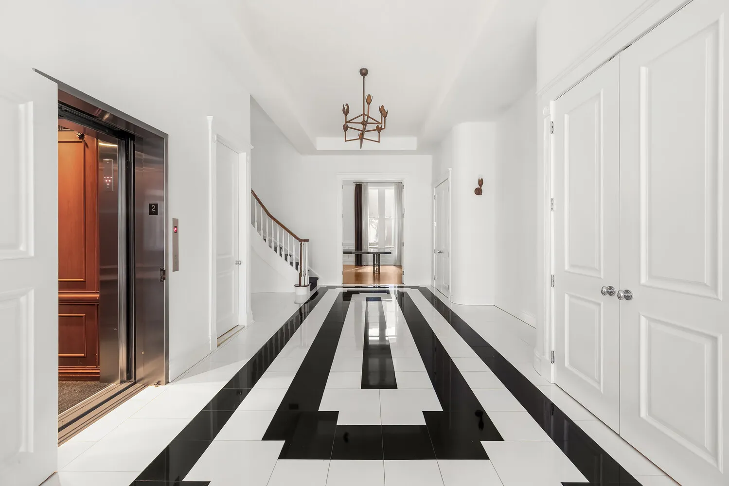 The elevator opens directly into the home, immediately revealing soaring ceiling heights and expansive living spaces designed for grand-scale living and entertaining. Oversized windows flood the residence with natural light, enhancing the dramatic proportions and architectural presence throughout.