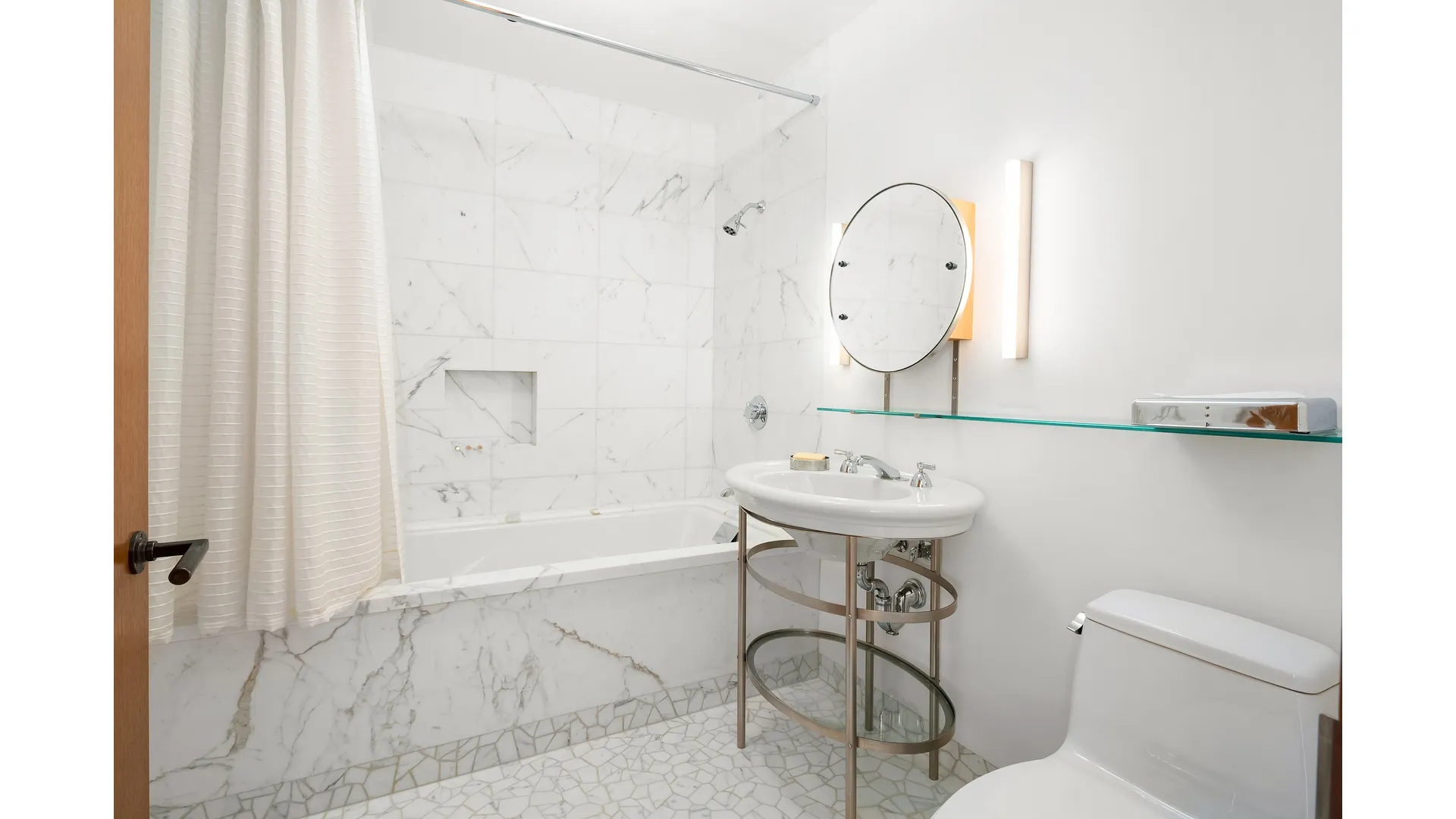 The design detail is extraordinary. The floors throughout are white oak with an oil finish that gives them a warm feel. Each fireplace offers a different exquisite marble surround and mantelpiece. The bathrooms also have individual stone tub enclosures and two of them have mosaic floors that were meticulously pieced together. Most of the hardware, whether handles to pull large sliding doors or knobs on bureaus, were custom made. Walls throughout were finished with venetian plaster and painted white to maximize the feeling of openness and light.