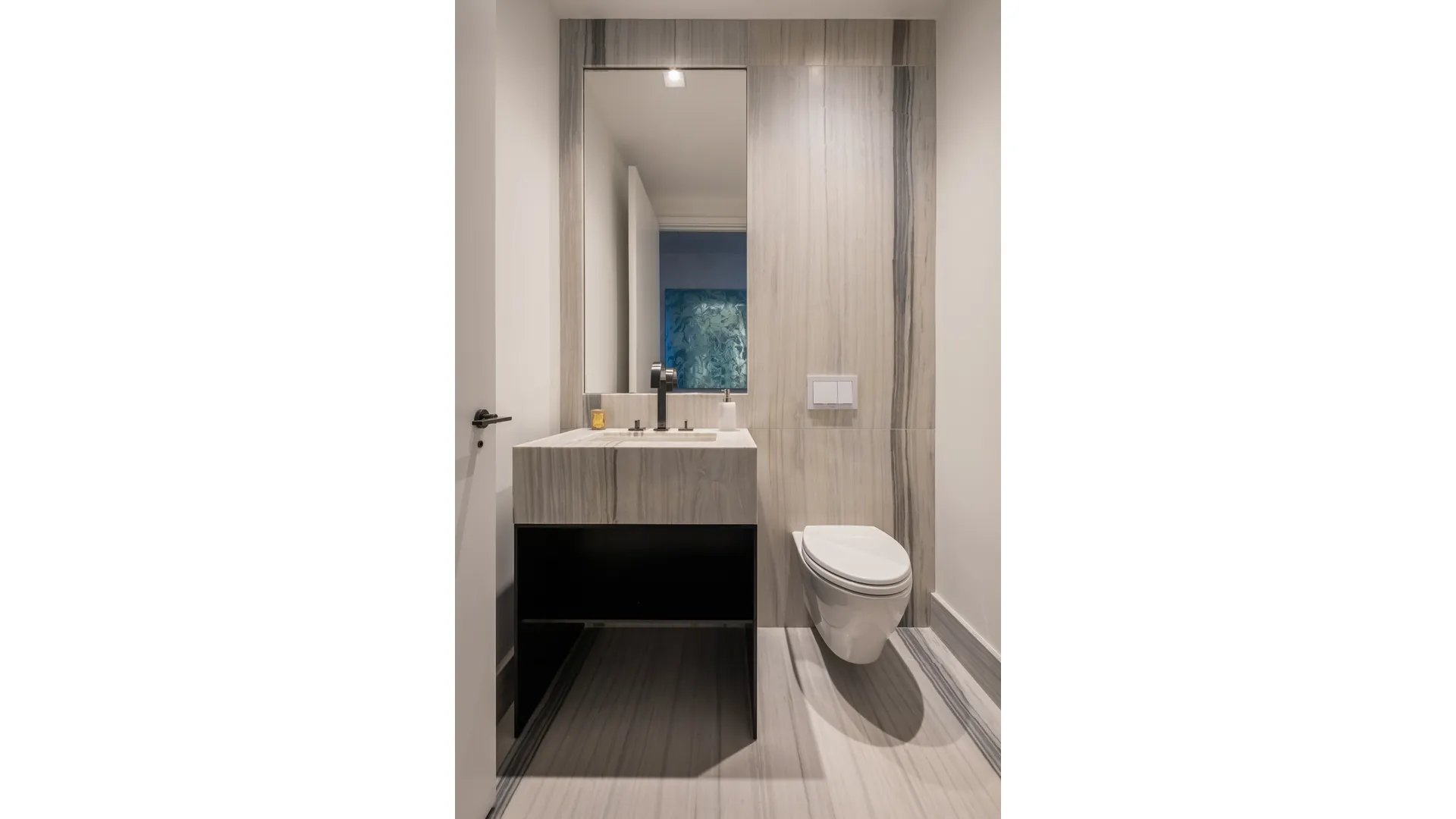 Meticulously designed by AD100 designer David Mann, the custom Molteni kitchen offers cerused White Oak cabinetry trimmed in custom soft black metal, Calacatta Borghini marble island with book-matched waterfall, countertop, and backsplash, Dornbracht fixtures in a custom soft black matte finish, pantry, and top-of-the-line appliances by Wolf, Miele, and Sub-Zero including a 36-in. refrigerator/freezer, 36-in. 5-burner gas cooktop with built-in fully vented hood, integrated dishwasher, wall oven, speed oven, and wine refrigerator. The palatial master bedroom suite offers a large walk-in closet and master bath with radiant heat floors, travertine stone slab feature walls, custom white marble slab double vanities with Dornbracht fittings and fixtures in a custom soft black matte finish, as well as a freestanding BluStone soaking tub positioned to enjoy the open south-facing views through a full-height window. A second bedroom with en suite bath, powder room, and utility closet with washer and vented dryer complete this magnificent residence.