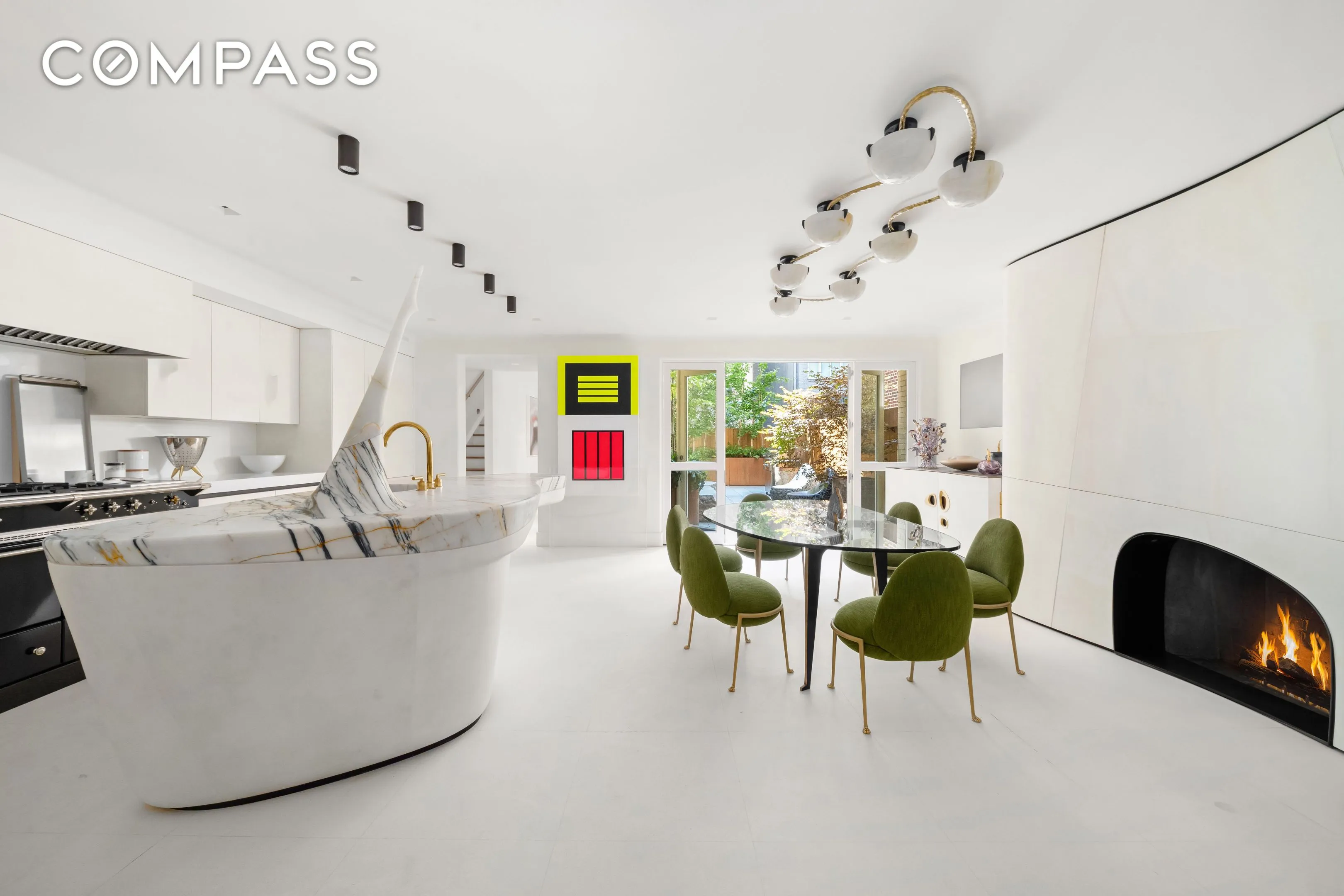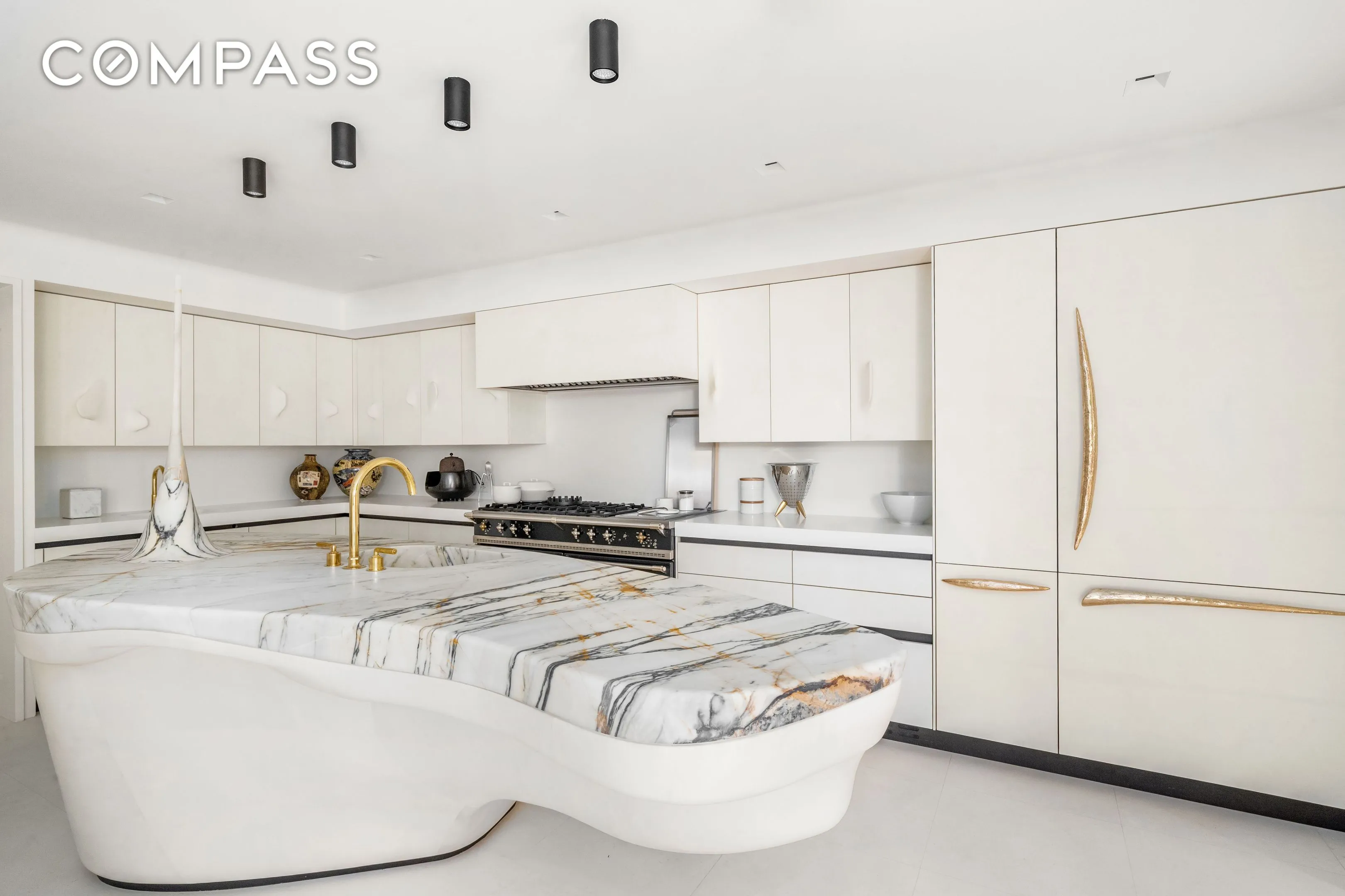The entry level is anchored by a showpiece kitchen by Achille Salvagni’s atelier, a $1M+ installation that elevates the space into functional art. Sculpted Calacatta Paonazza marble, custom cabinetry, and integrated appliances are paired with a dramatic island and bespoke detailing throughout. Floor-to-ceiling glass doors open directly to a landscaped garden, creating a seamless indoor-outdoor connection.